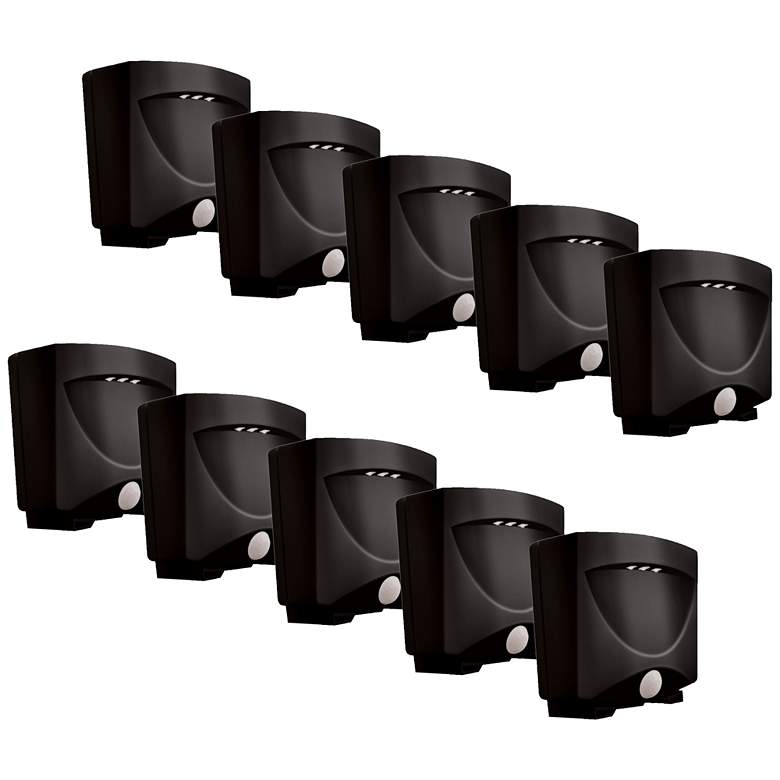 Brighten a backyard or driveway pathway with this 10-pack battery LED motion-activated outdoor night light set. Each bronze finish night light flips on only when it's needed thanks to a built-in motion detector that senses movement within a 10 feet radius and remain on until 30 seconds after the last detected movement. An integrated light-sensor also conserves each night light's power during the day, activating each unit at dusk.