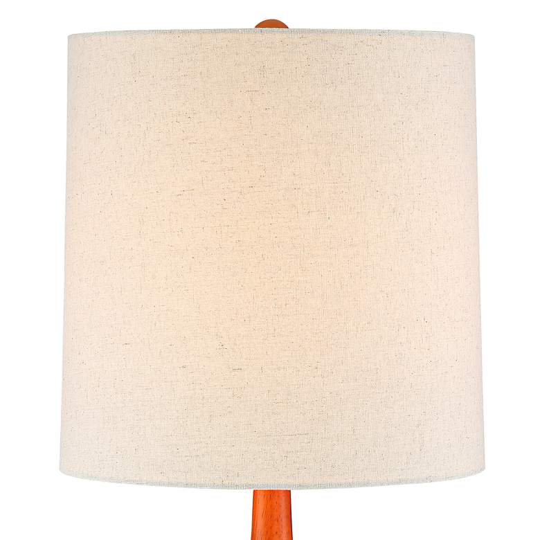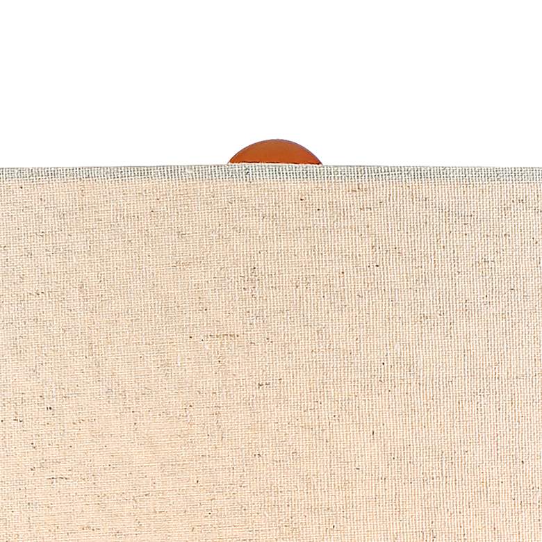 - Warm red oak finish wood neck and bottom. Off-white fabric cylinder shade. 7-foot long black cord and plug.