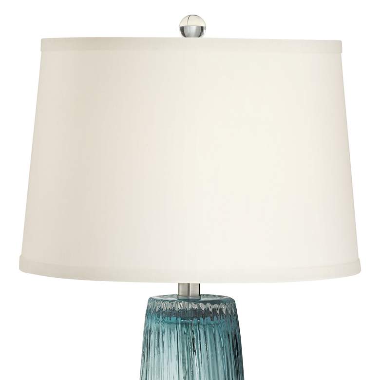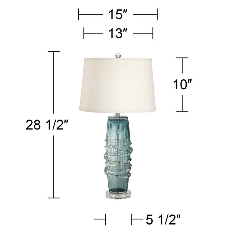 - Blue Sea color glass lamp body. Clear glass pedestal accent. Use to accent modern room spaces or coastal decor.