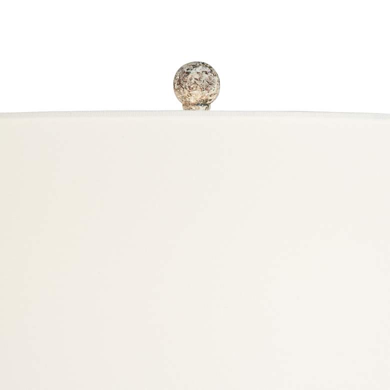 - Lamp base has a weathered vintage finish. White color base with earth tone accents. Cast resin construction.