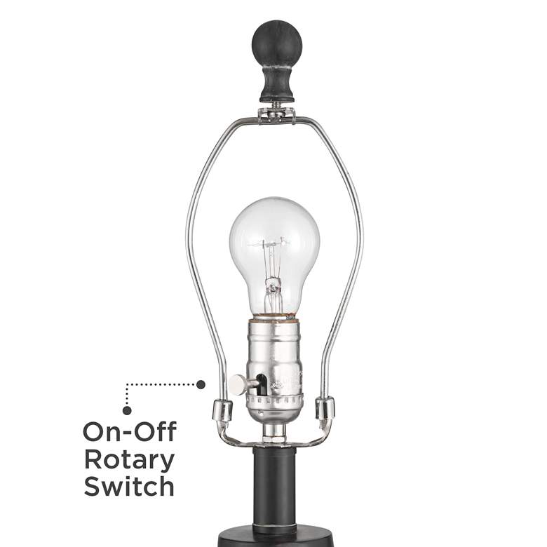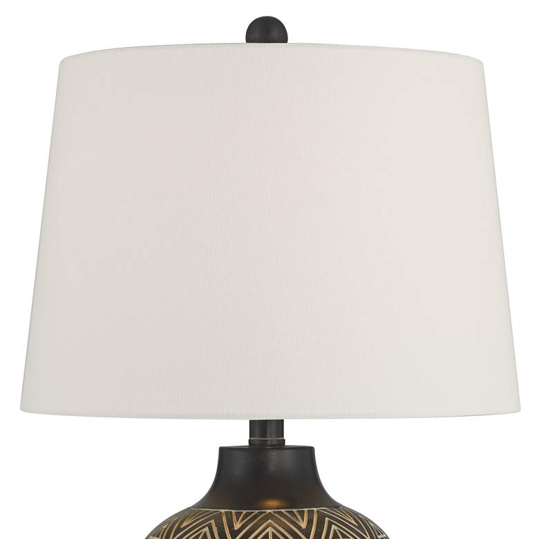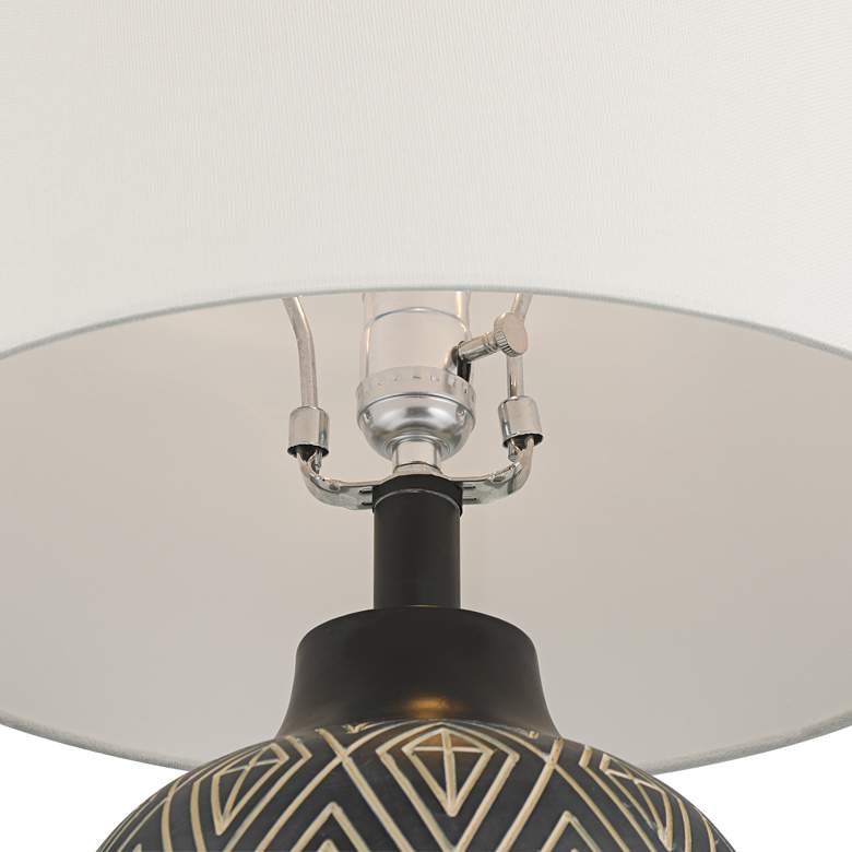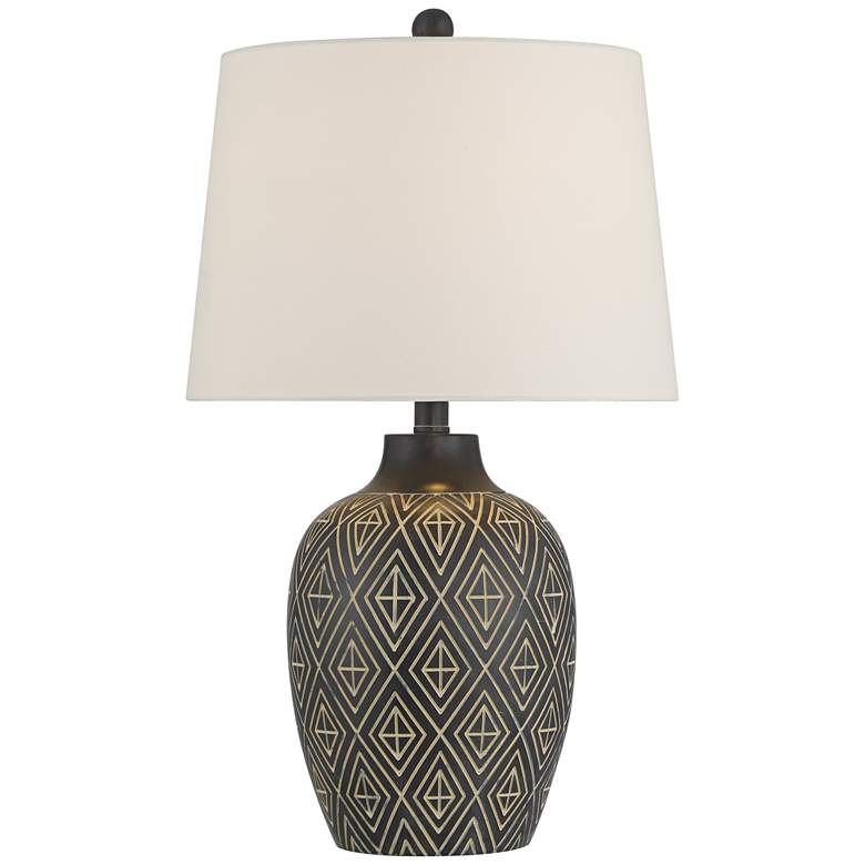 This lamp showcases a beautifully patterned base with a geometric diamond motif, creating a stylish focal point for any room. The jar-shaped body is finished in a neutral black finish that complements a wide range of decor styles, from contemporary to boho transitional. A white empire shade sits atop the design, diffusing light for a warm and inviting glow. Perfect for bedside tables, living rooms, or entryway consoles, this table lamp brings both sophistication and functionality to your home lighting.