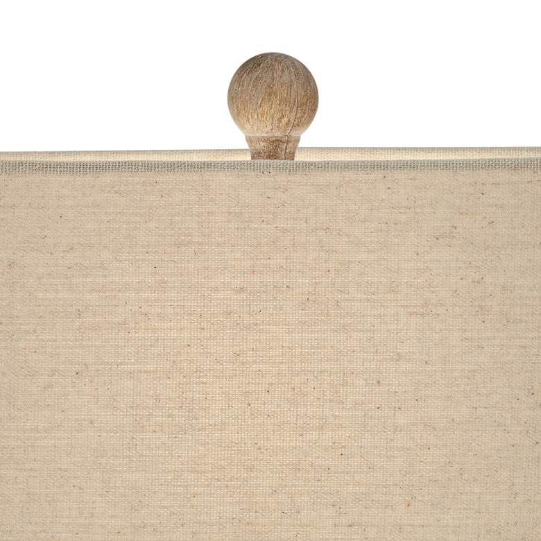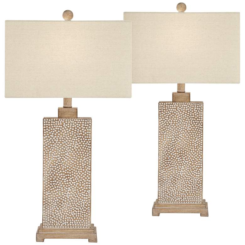 Ideal for modern farmhouse rooms or for adding a contemporary luxe look to a favorite space, these lamp designs will shine in any setting. From the 360 Lighting brand, the pair of lamps feature hammered rectangular bases with a footed pedestal base in a faux wood finish. Up top are oatmeal fabric rectangular shades that complete the look.