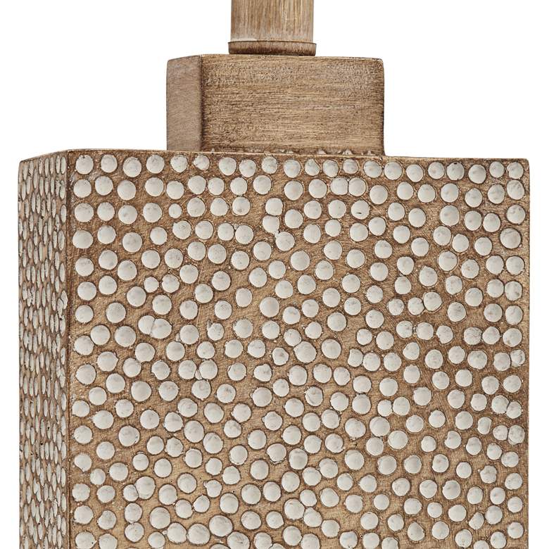 - Earth-tone finish bases with a hammered pattern. Faux wood footed pedestal at bottom. Cast resin construction.