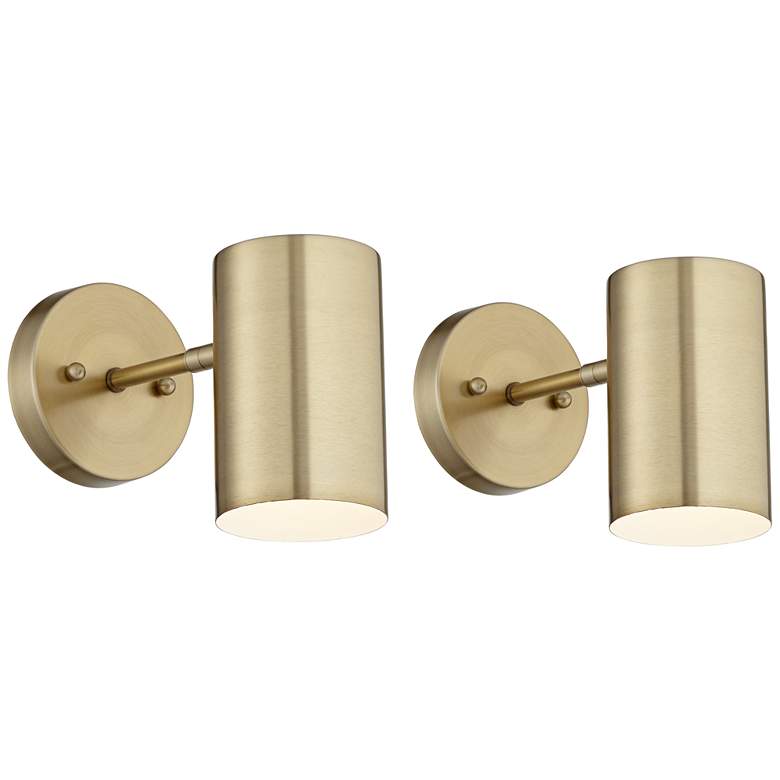 - Contemporary adjustable hardwire wall lamps set of 2 from the Carla collection by 360 Lighting. Polished brass finish over metal construction. Cylinder down shade design.