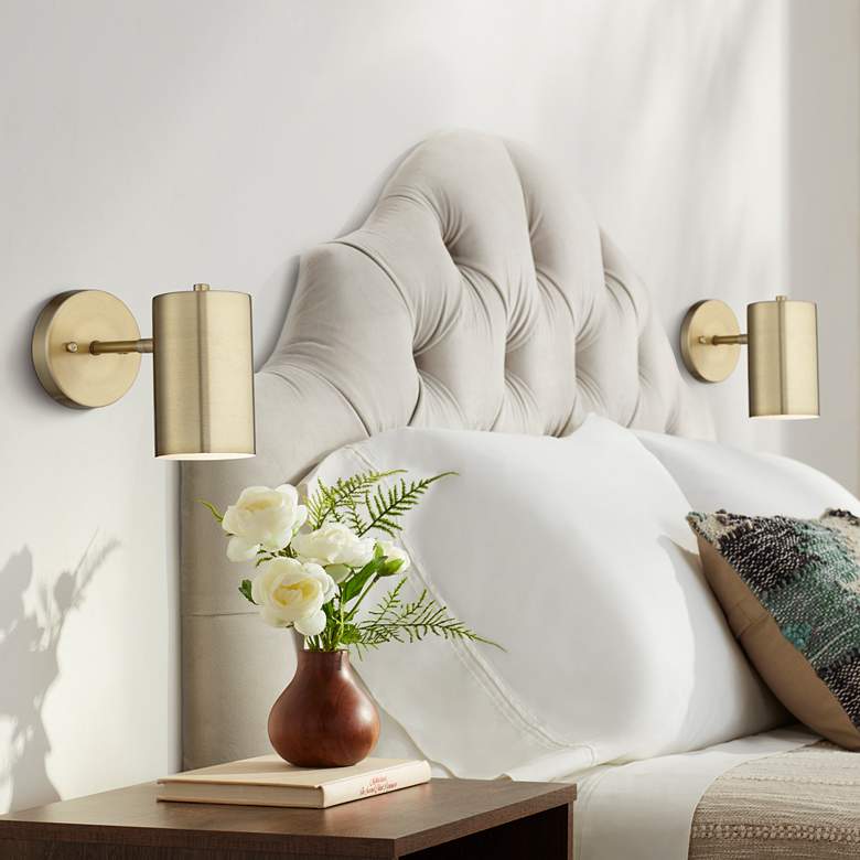 Get function and utility with these contemporary hardwire wall lamps set of two. Each comes in a polished brass finish metal frame, which consists of a cylindrical down shade attached to a round backplate, resulting in a simple and classic look. The shade conveniently adjusts from all angles to direct light to the area desired. Note: these are not plug-in wall lamps, they require hardwire installation and are operated from a wall switch.