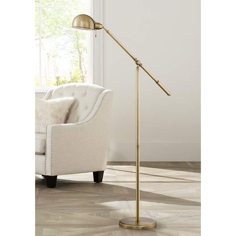 Upgrade the lighting in your space with this classic pharmacy floor lamp. The low-profile design in an antique brass finish has a boom-style arm that can be adjusted to cast light at a variety of angles. A sleek metal shade creates ample downward illumination in your space.