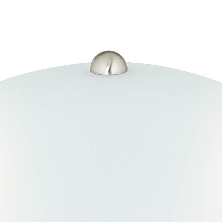 - White frosted glass dome shade. Brushed steel metal base. 6-foot long cords.
