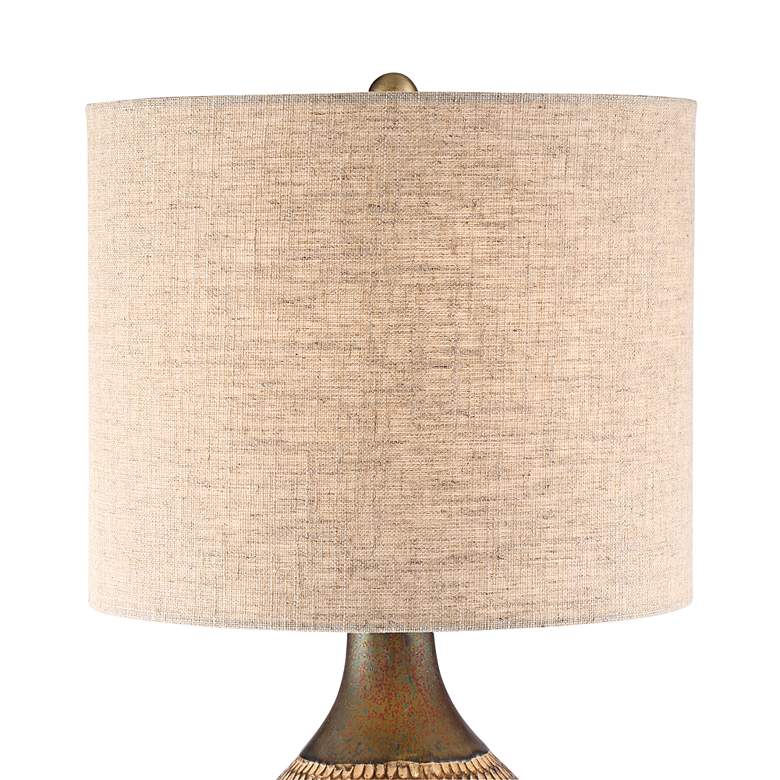 Inspired by the timeless appeal of the Mid-Century modern style, this table lamp offers relaxed elegance for contemporary room spaxes. An instant classic from 360 Lighting, the design features a wood brown lamp ceramic base construction that is decorated with a beautiful textured pattern. Up top is an oatmeal color drum shade.