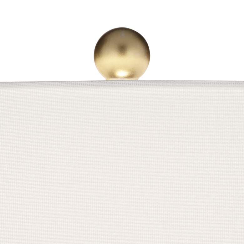 From the 360 Lighting brand, these modern ceramic table lamps offer a bright accent for bedrooms or living room lighting. The pair of lamps come with cylinder profiles in a gray textured ceramic finish. Gold finish metal accents brighten the look. Up top is a tapered drum shade in a white fabric with a gold finish ball finial as a final touch of style.