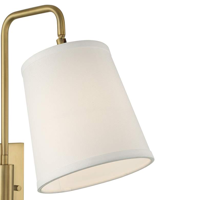 - Warm brass finish over metal construction. White fabric shade. Swing arm moves side to side. Shade can be adjusted up and down. Plug-in installation - easy to install with no wiring required.