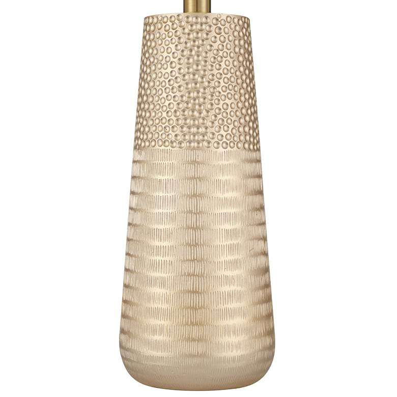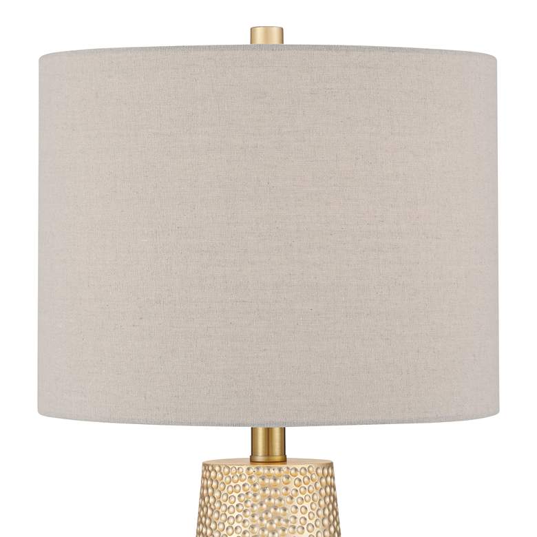 Bring a touch of sophistication to your decor with this set of two textured gold table lamps from 360 Lighting. each lamp features a beautifully detailed gold finish that adds warmth and shine to any space. The clean lines of the base are paired with oatmeal color fabric drum shades, creating a harmonious blend of modern and timeless design.