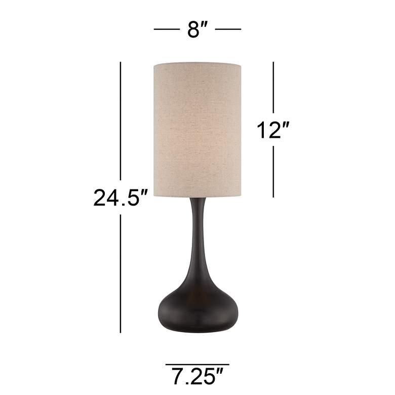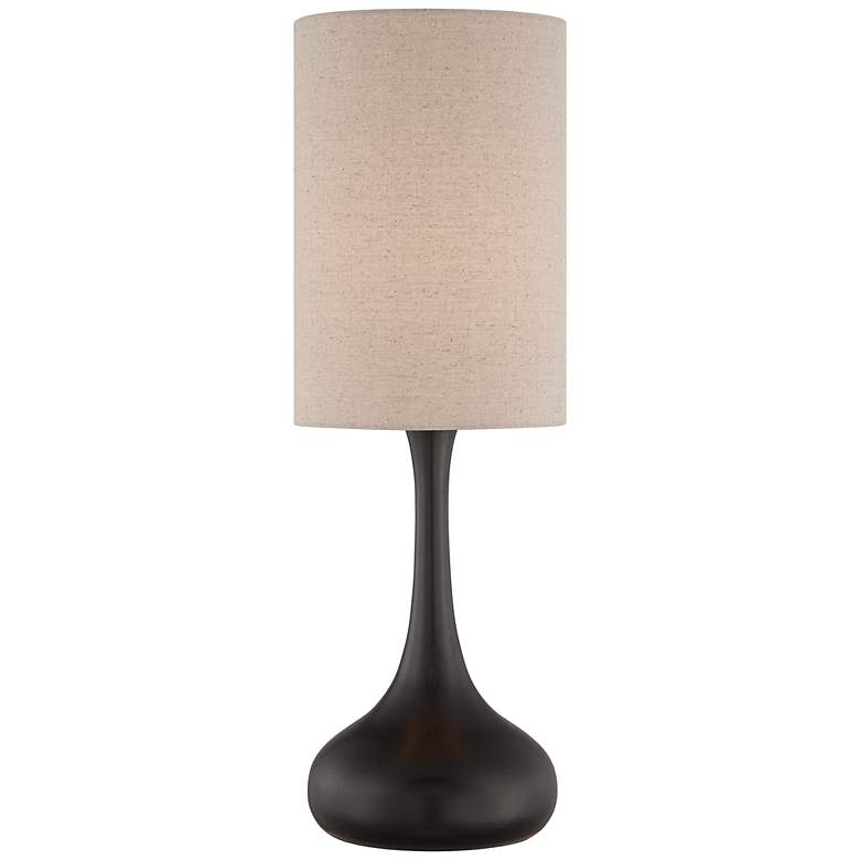 Get contemporary with this beautiful modern table lamp design. The sleek droplet body is impressive with an espresso bronze finish and fluid lines. The striking tan cylinder shade looks crisp and clean and contributes to the vertical interest of this updated design.