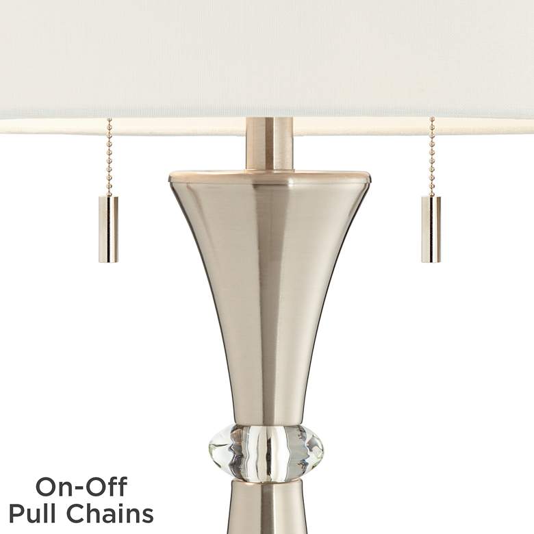 Elegantly designed by 360 Lighting, this set of two metal table lamps features two lights in each lamp, for ample illumination in a living area or bedroom. Each lamp boasts a sleek finish over a subtle hourglass silhouette punctuated with a clear oval disc that sparkles in the light. Double pull chains and a drum shade tops each lamp in this contemporary set.