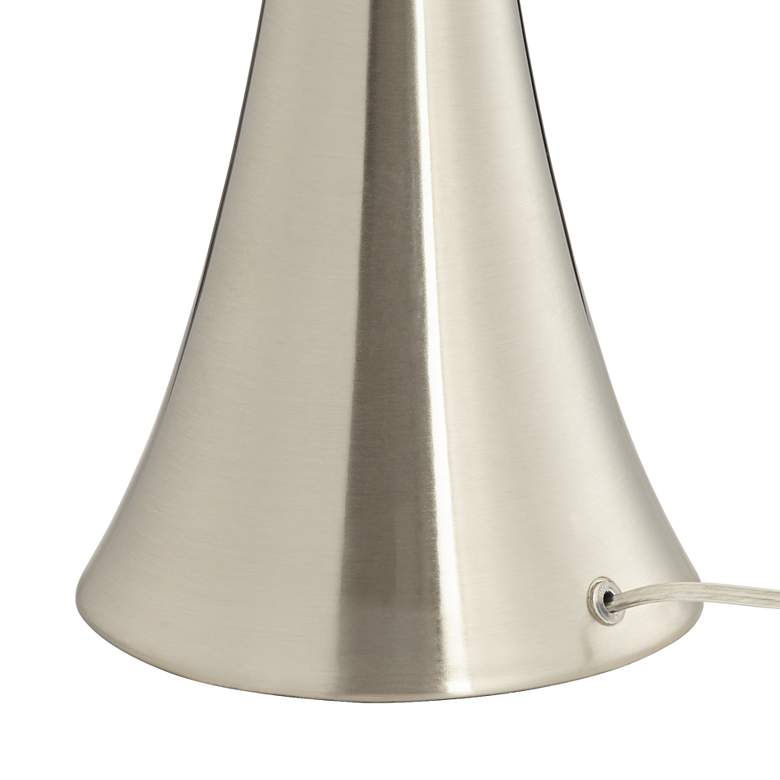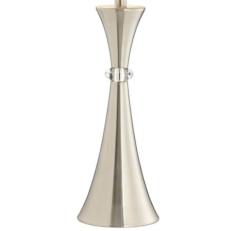 - Silver finishes. Concave column base. Metal construction. Clear glass accents.