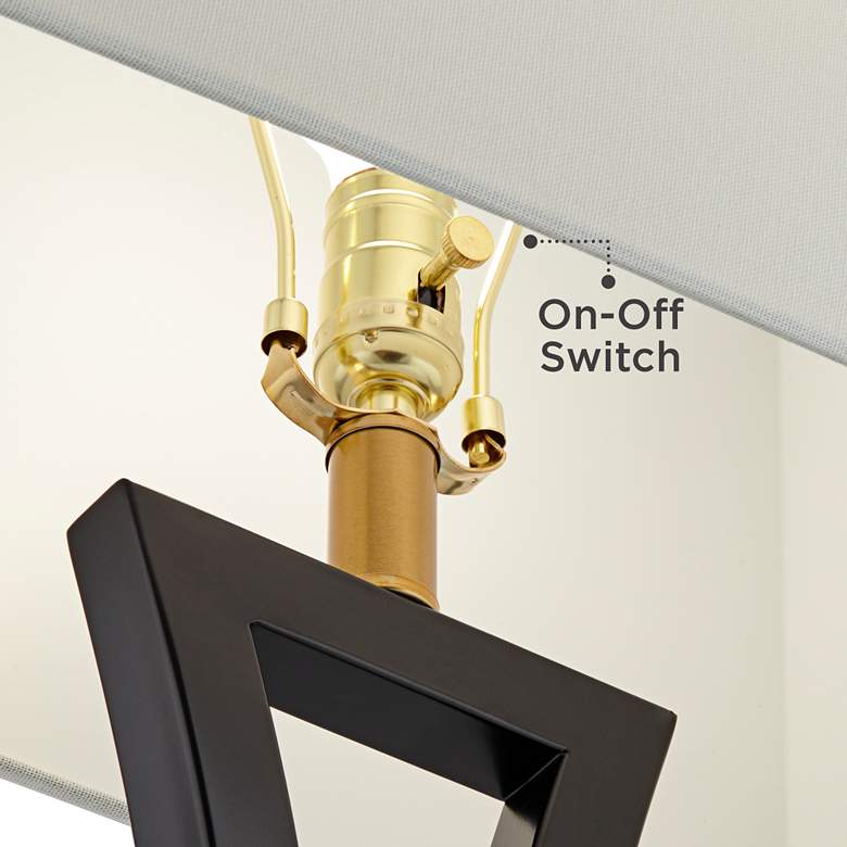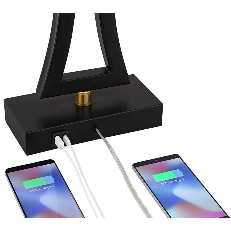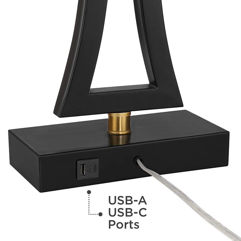 Create a cohesive look in your bedroom or living room with this modern table lamp set. From the 360 Lighting brand, each lamp comes in a sleek black finish for a contemporary shine. The metal frame offers an eye-catching geometric look with a curved, opened-up column sitting atop a flat rectangular base. An off-white rectangular lamp shade delivers an angular flair with a charmingly rounded finial on top. USB charge ports in the bases offer a handy way to charge phones and other devices.