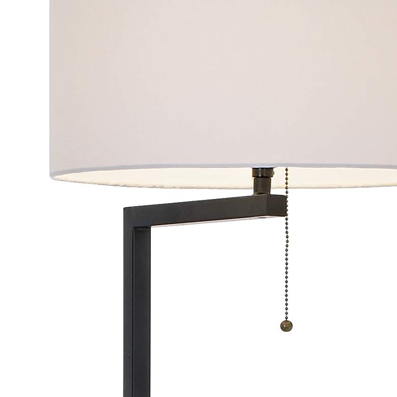 - Black finish metal frame. White fabric drum shade up top. 8-foot long cord.