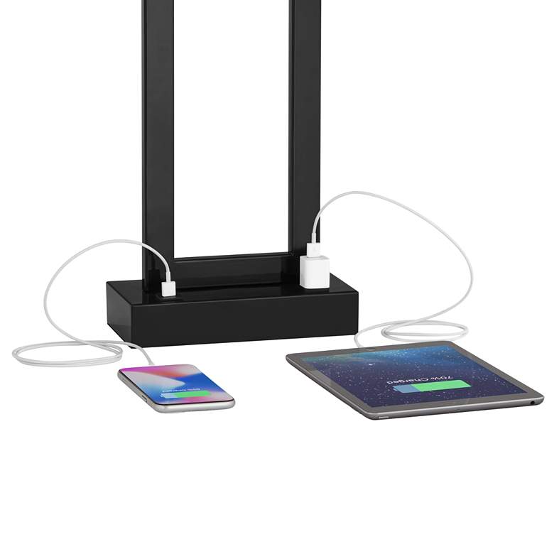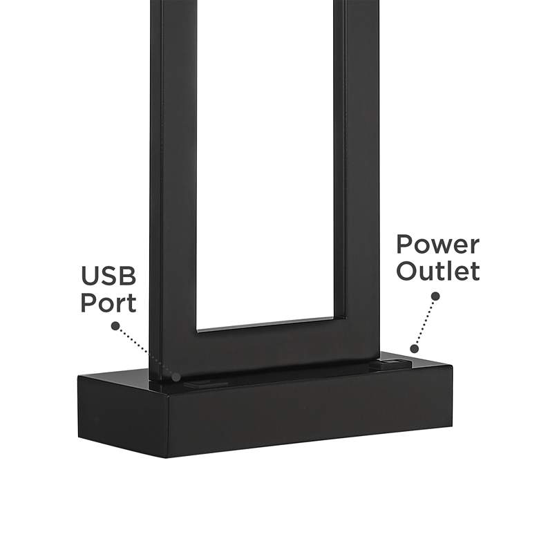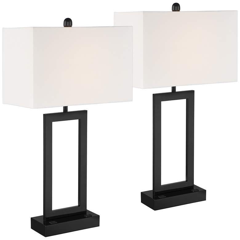 Update a custom contemporary space with a pair of lamps adding minimalism with functional bonuses. This set of two modern metal table lamps from the Todd collection by 360 Lighting employs simplicity and clean lines to achieve sophistication with black finish metal construction calling attention to a rectangular open design. Rectangular white fabric shades provide perfect contrast, and built-in 2-amp USB ports join an electrical outlet to make each lamp a de facto charging station.