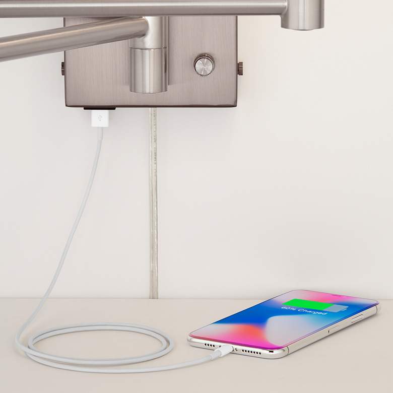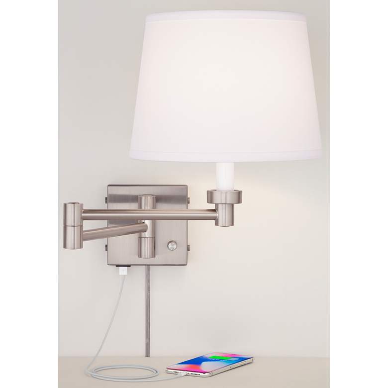 - Set of two modern plug-in swing arm wall lamps with USB charging ports by 360 Lighting. Brushed nickel finishes. Metal construction. White hardback shades.