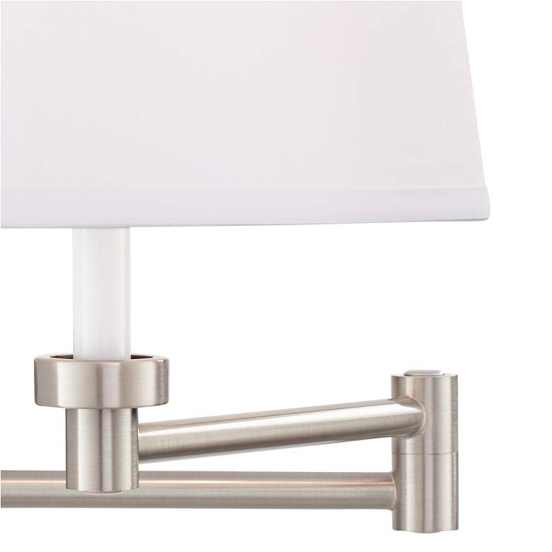 From the Vero collection by 360 Lighting comes a pair of wall lamps that deliver on function and ambiance. This set of two modern plug-in swing arm wall lamps feature USB charging ports that expand convenience. Brushed nickel finish metal frames and white hardback shades add a crisp, clean aesthetic. These lamps plug directly into wall sockets and add integrated USB charging ports to power up devices