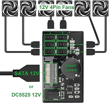 4 Pin 12V PWM Fan Controller 6 Fans Supported , PC Fan Adapter Hub Powered by SATA and DC 5525, Cooling Fan Speed Knob with Max Total 60W 5A Output Color: Black Brand: OwlTree Voltage: 12 Volts Product Dimensions: 2.7"L x 1.6"W x 0.7"H Manufacturer: OwlTree About this item: Supports 6pcs 4 Pin PWM Fans (Fans not included, Not compatible with 3-pin/2-pin fans) Flexible Power Supply Input: Compatible with both SATA 12V and DC 5.5×2.5mm (5525) 12V input, allowing flexible power options Maximum total power output: 60W (5A@12V), with each port supporting up to 2A current while total combined current shall not exceed 5A Adjustable PWM duty cycle: 1%–99% Package include: a 4 Pin 12V PWM Fan Speed Controller ONLY