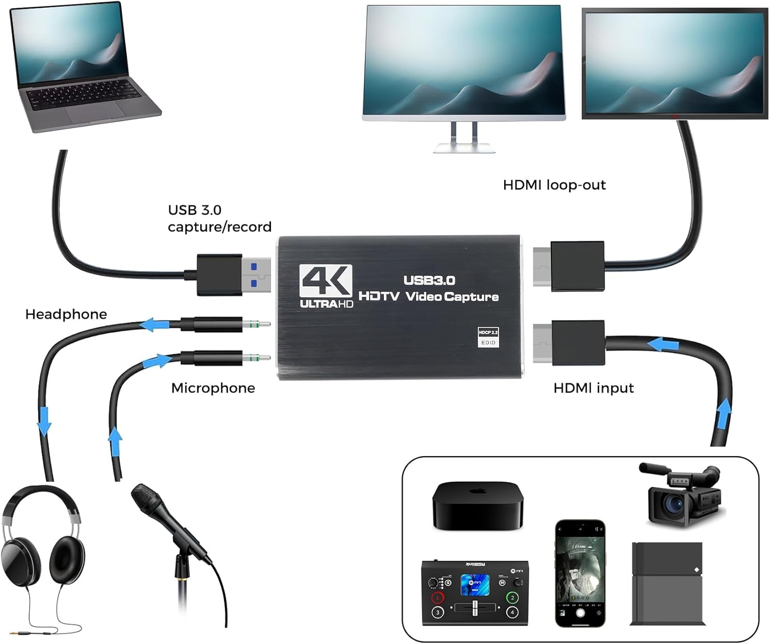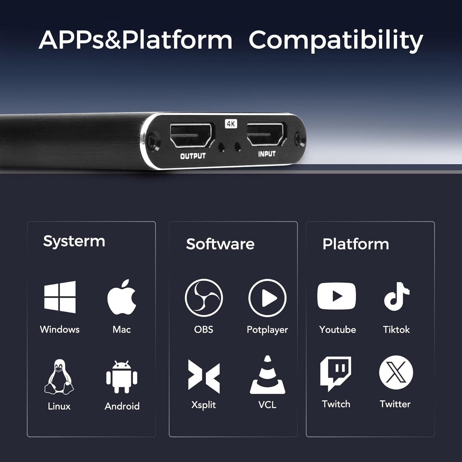 - 【Wide Compatibility & Streaming Software Support】This 4K HDMI capture card supports Windows, MacOS, Linux, and Android. The capturadora de video works with Nintendo Switch, PS5, DSLR, webcams, and TV boxes. Compatible with OBS Studio, PotPlayer, VLC, and more—perfect for a capture card for streaming and recording.