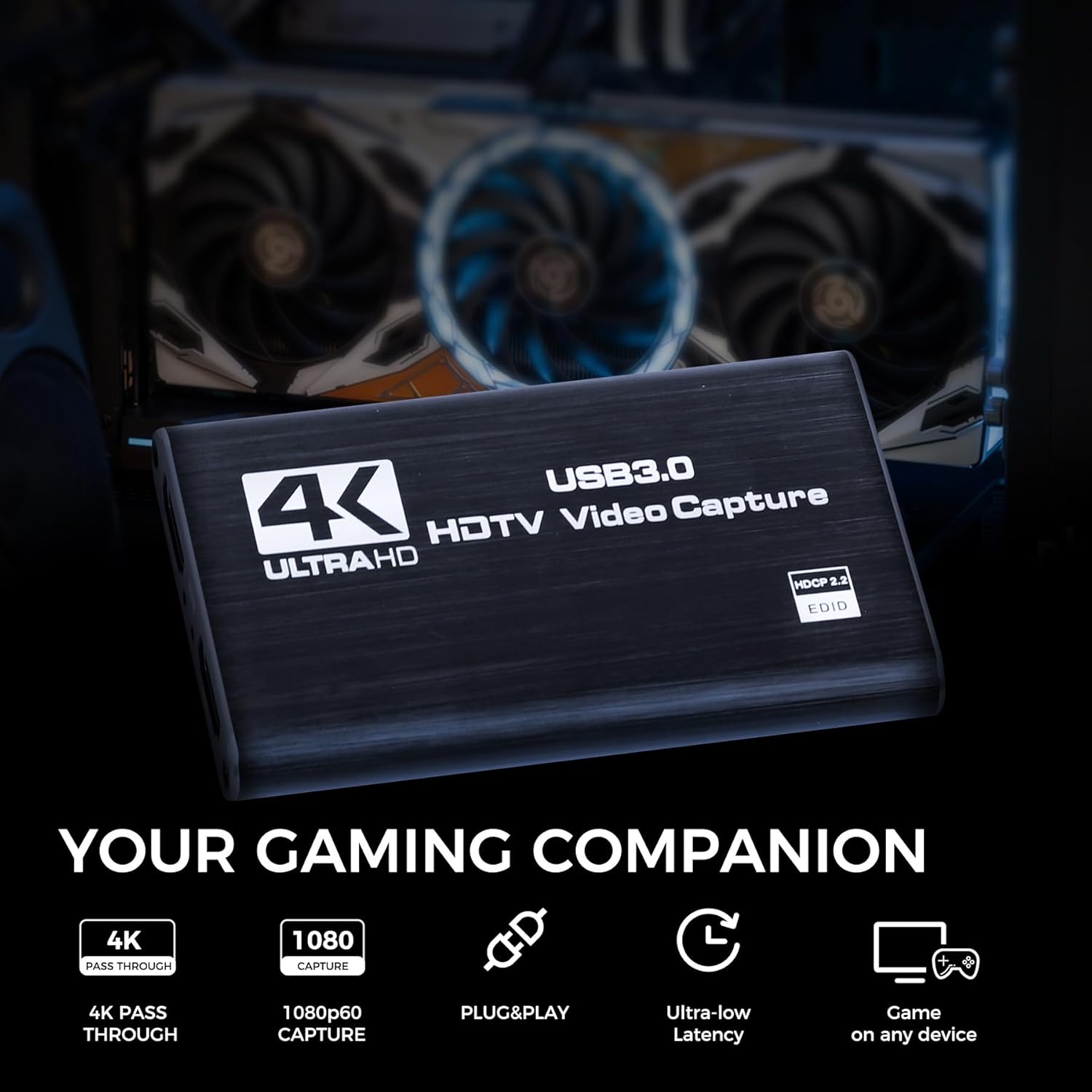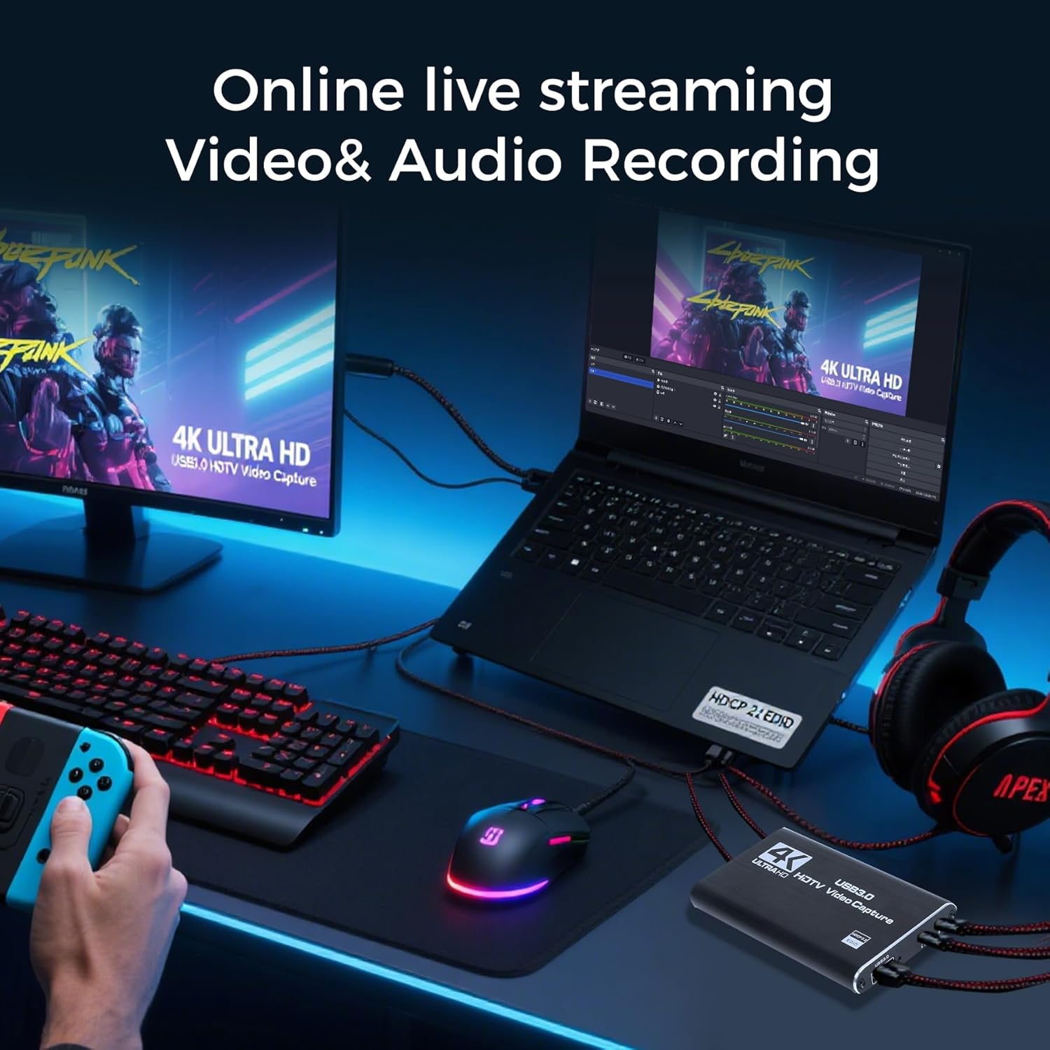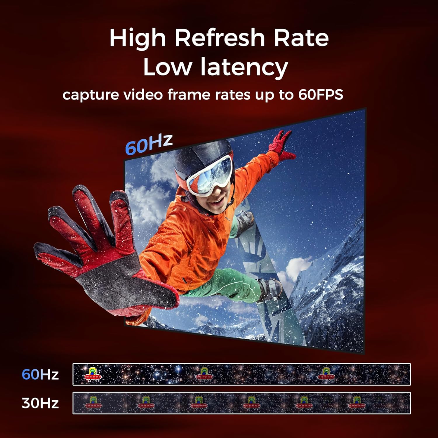 - 【Plug & Play, Low Latency, Solid Build】This USB3.0 capture card for streaming ps5,xbox, switch works without drivers. Just connect your device—PS5, Switch, or PC—and start recording instantly. The aluminum body improves heat dissipation for stable use during long HDMI game capture or live sessions.