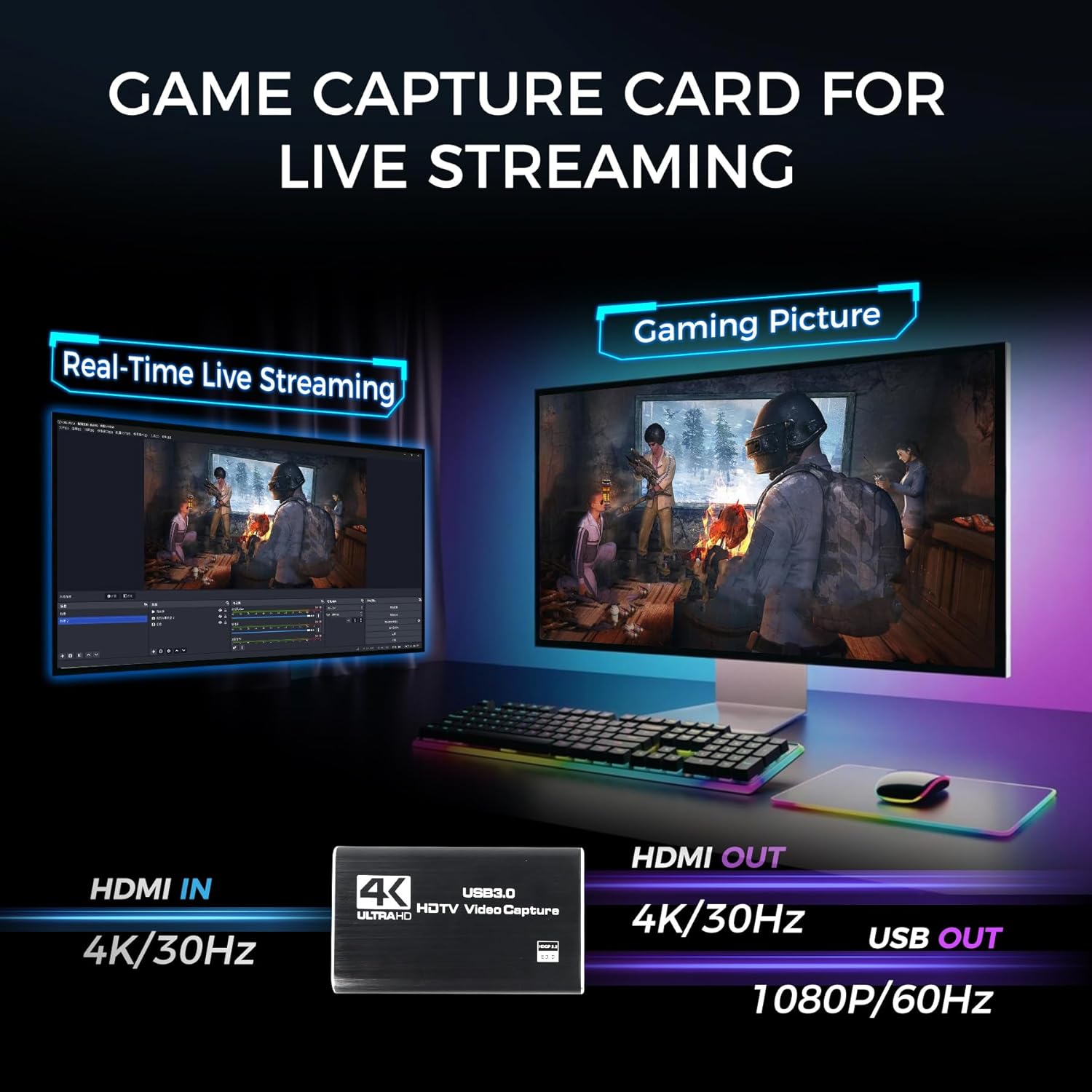 - 【4K Loop-Out & 2K30 Capture, YUY2 Supported】This 4K HDMI video capture card for streaming supports 4K@60Hz input and loop-out,1080P@60Hz USB3.0 output. The HDMI to USB video capture supports YUY2 format for high-frame-rate video capture and smooth real-time game streaming and recording.(Note:Max HDMI input is 4K@60Hz when HDMI out is not connected.If HDMI output is connected, the highest resolution HDMI input can receive is subject to the display and the resolution is no more than 3840*2160@30Hz. — e.g. 1080P monitor allows max 1080P input; 4K monitor allows up to 4K@30Hz)