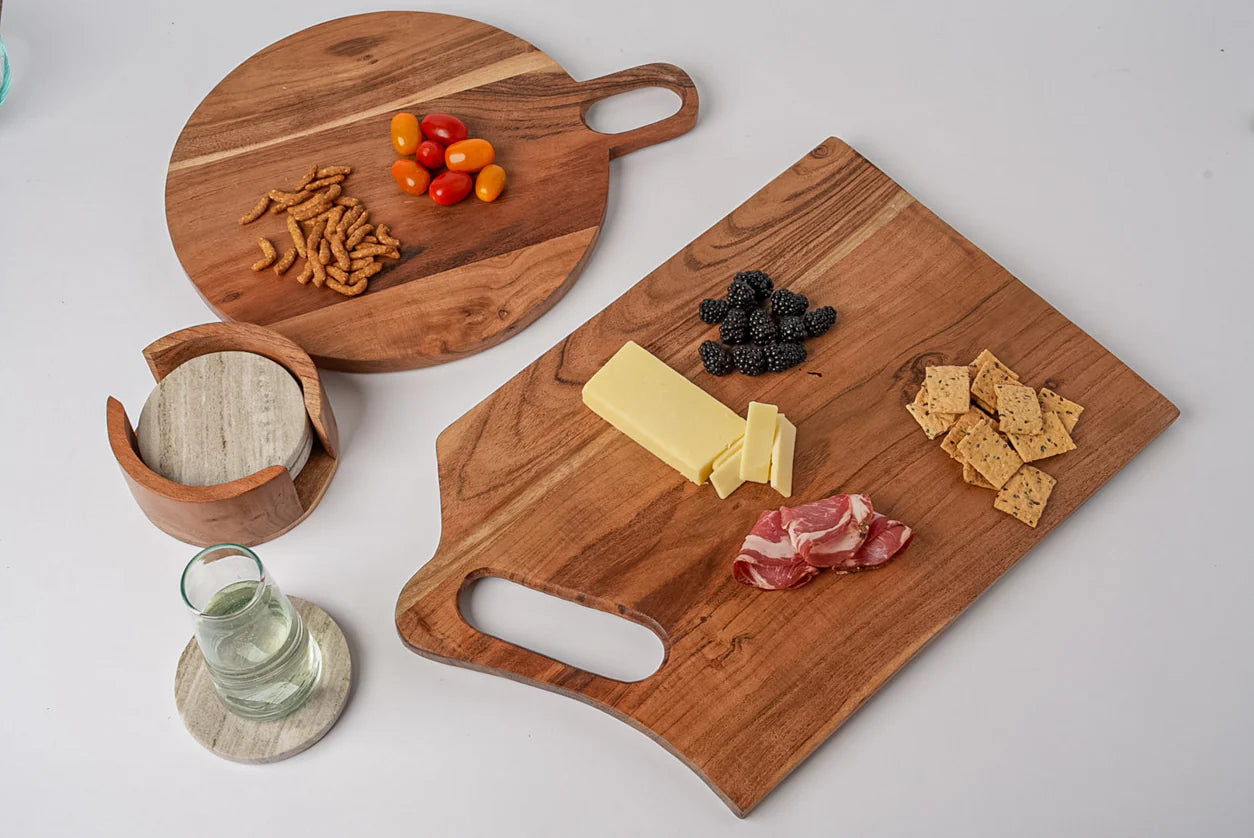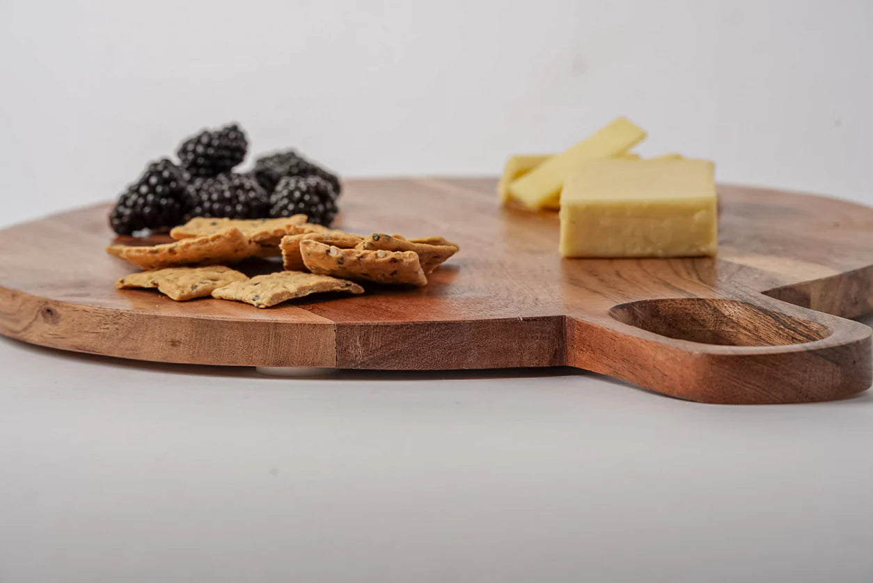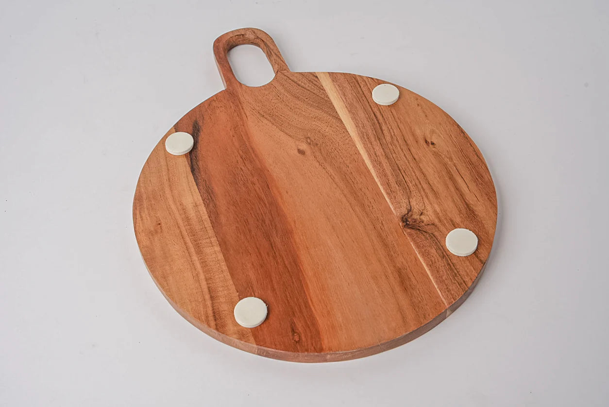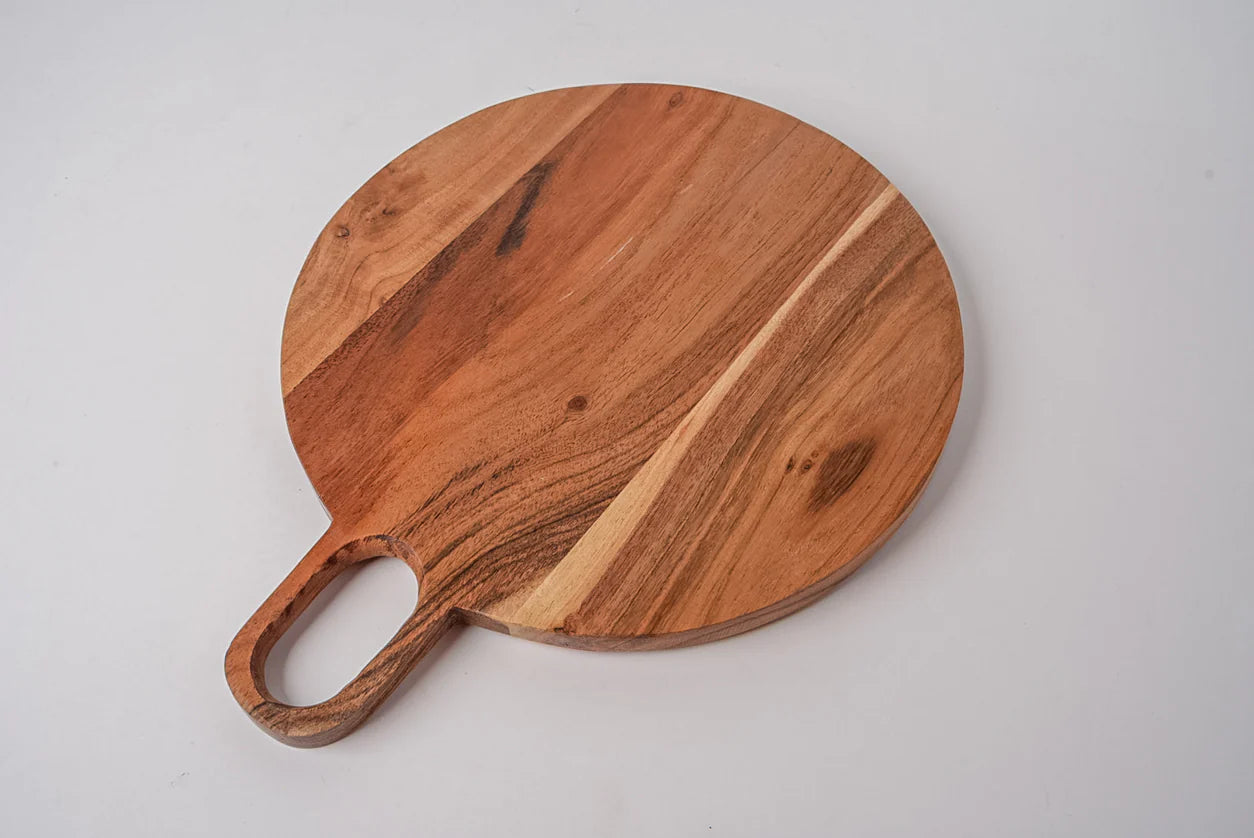 Acacia Wood is naturally durable, water-resistant, and rich in warm tones and unique wood grain patterns. This board is very versatile – Ideal for serving charcuterie, pizzas, cheeses, bread, and more. The smooth, circular shape delivers a stunning presentation and easy serving. Each board is handcrafted and unique, featuring distinct wood grain patterns, making every piece one of a kind.