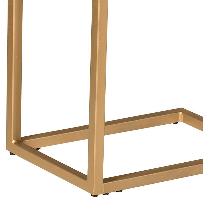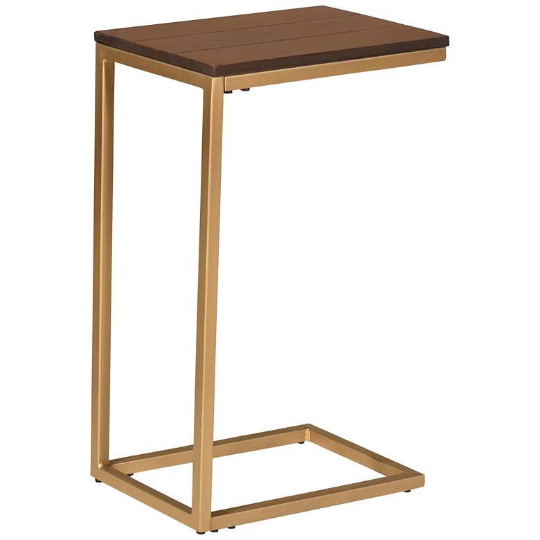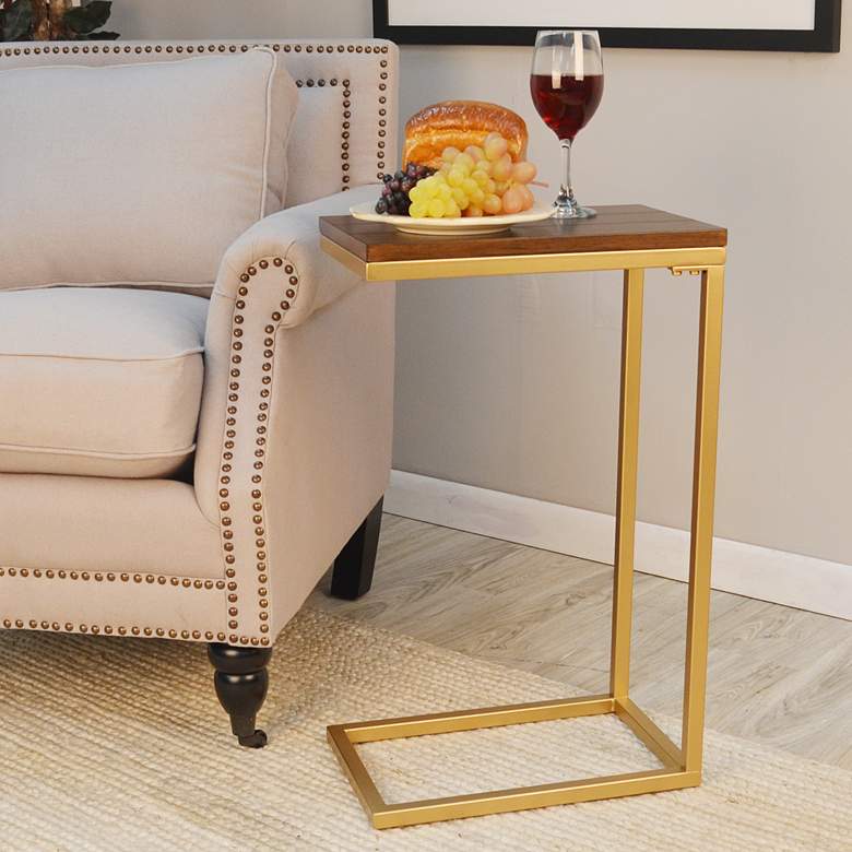 Keep your laptop or tablet close at hand with this compact, C-shaped computer tray table. Lovely in a powder coated gold finish over a tubular frame, the table is complete with a beautiful elm finish grooved wood tabletop while its base slides under the edge of a sofa, bed, or armchair. This table is a fantastic solution to a compact space that doesn't allow for a dedicated home office space while is adds wonderful style to any space.
