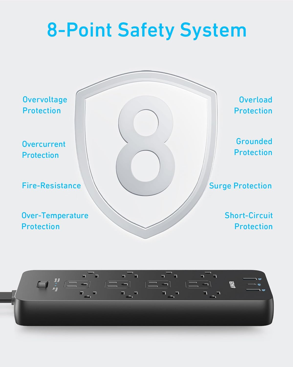 - 8-Point Safety System: Combines surge protection, fire resistance, overload protection, temperature control, and more to protect you and your devices.