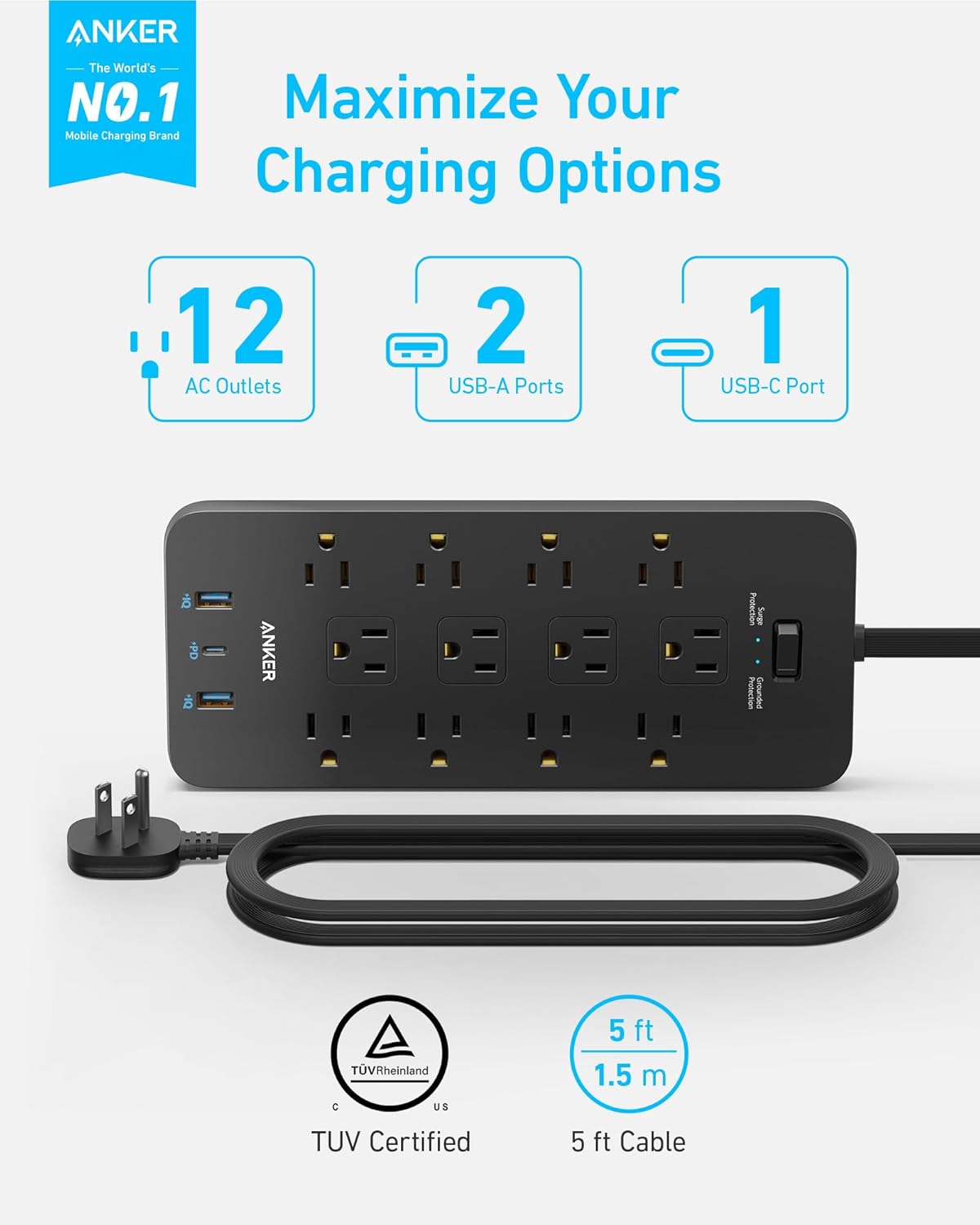 Anker Surge Protector Flat Plug Power Strip(2100J), 12 AC Outlets, 5feet Flat Extension Cord, 1USB C and 2 USB Ports... Read more Read more