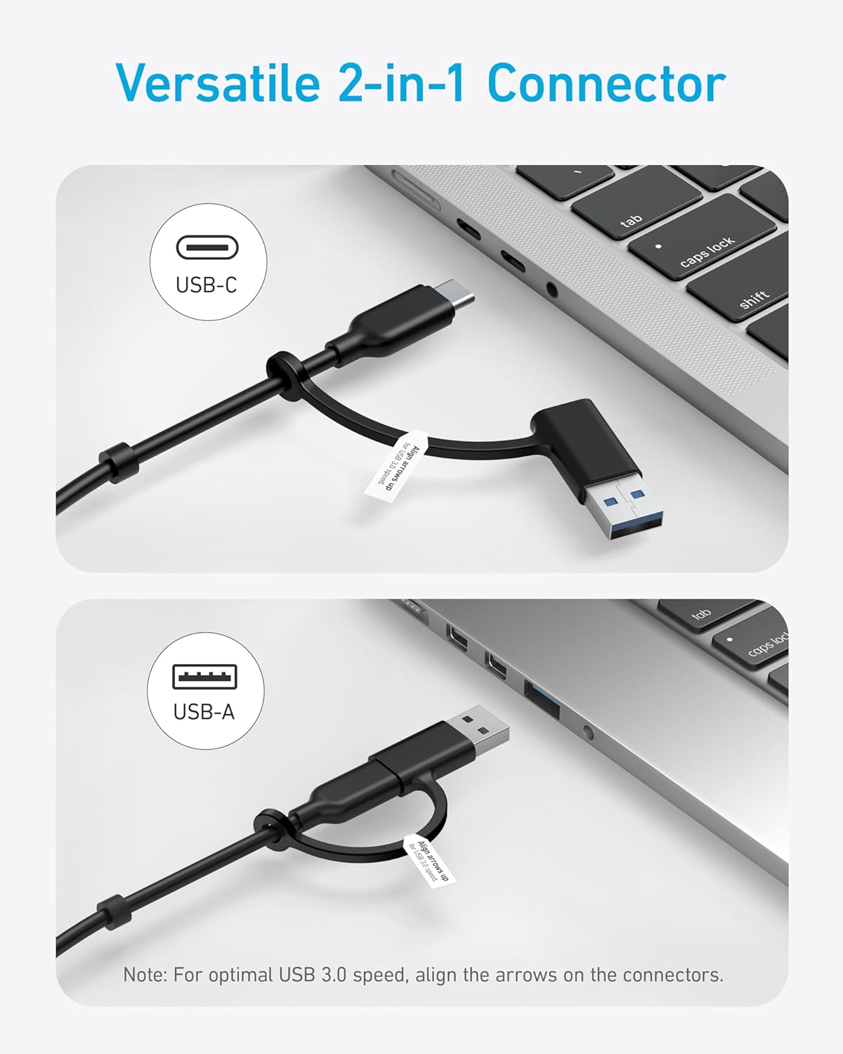 - 2-in-1 Connector: Equipped with a versatile 2-in-1 connector that effortlessly adapts to both USB-C and USB-A devices for maximum compatibility.
