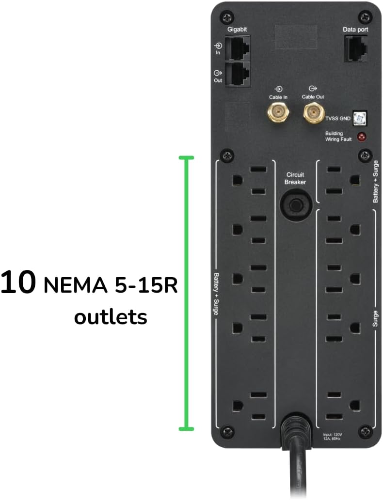 - 10 Outlets (NEMA 5-15R): 6 surge protector with battery backup; 4 outlets with Surge Protection Only. Powerchute UPS management via dedicated data port (Windows 10, 22H2 Pro, 11 Pro. For Mac OS, use native "Energy Saver" Settings)