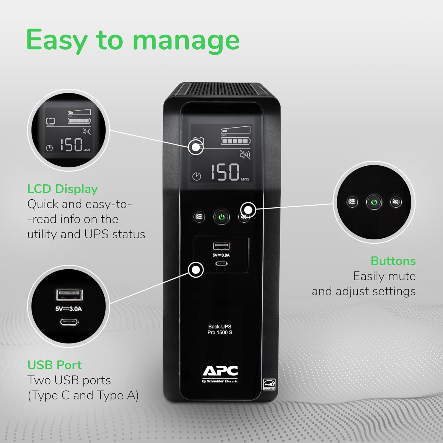 - Replaceable Battery: Easily replace the battery back up with a genuine APC replacement battery, model APCRBC163 (sold separately)