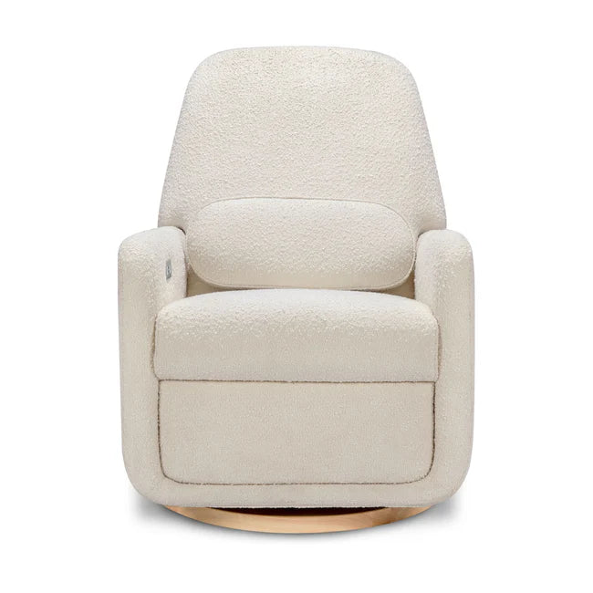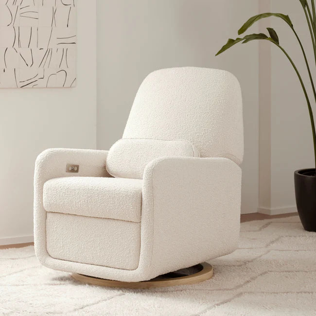 Lean curves, taut lines and a tailored execution matched with a pill-shaped lumbar pillow make the Arc Recliner a refined, yet playful statement piece in the nursery. The chair's array of luxe fabric upholstery with complementary wood base provide a touch of luxury, while a smooth swivel and glide motion, a built-in USB port and electronic recline mechanism allow you and your little one to recharge in ultimate comfort and modern style.