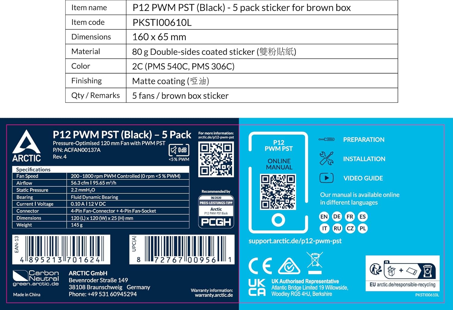 ARCTIC P12 PWM PST (5 Pack) - PC Fans, 120mm Case Fan, PWM Sharing Technology (PST), Pressure-optimised, Quiet Motor, Computer, 200–1800 RPM (0 RPM <5%) - Black