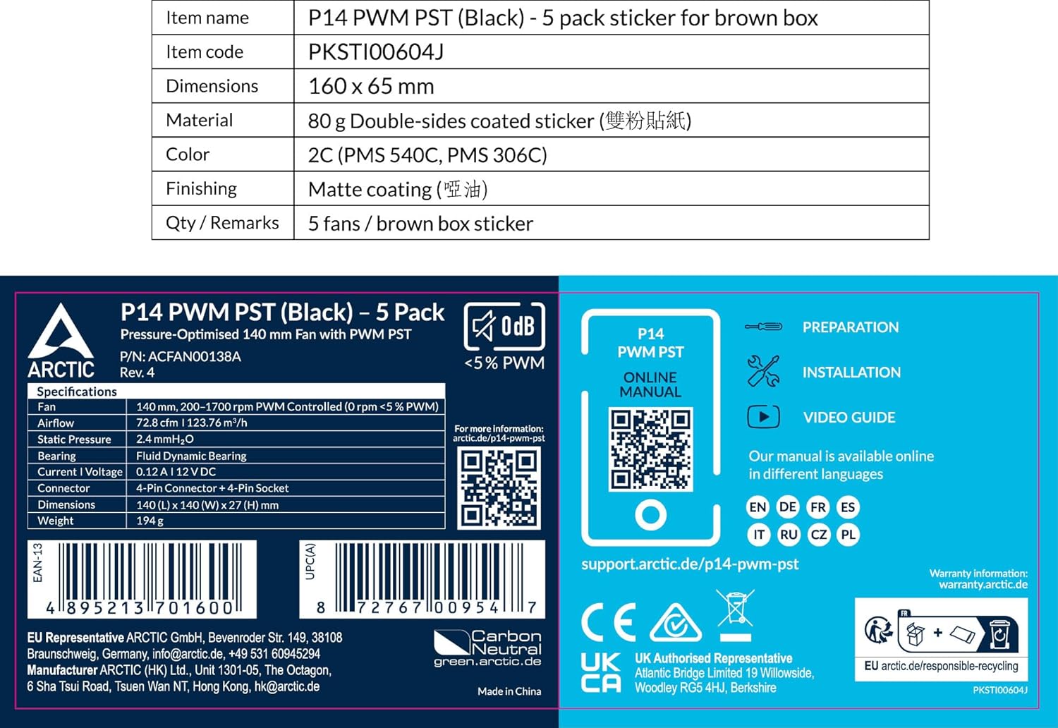 ARCTIC P14 PWM PST (5 Pack) - PC Fans, 140mm Case Fan with PWM Sharing Technology (PST), Pressure-optimised, Quiet Motor, Computer, Fan Speed: 200–1700 RPM (0 RPM <5%) - Black
