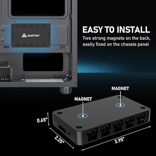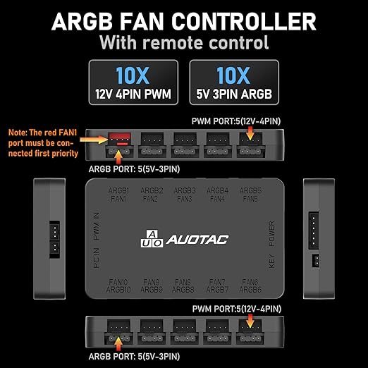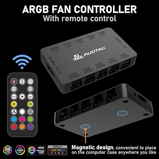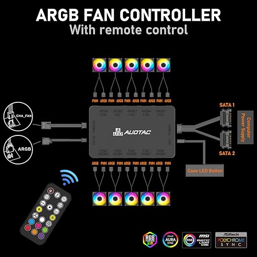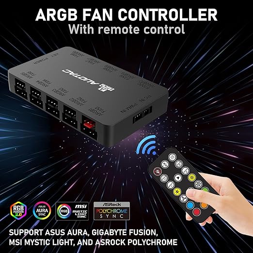 ARGB Controller PWM Fan Hub with RF Remote, (Connect Ten Case Fans, 5V 3Pin ARGB & 12V 4Pin PWM Fan Connector, Dual SATA Power Input, Magnetic Suction), Black
