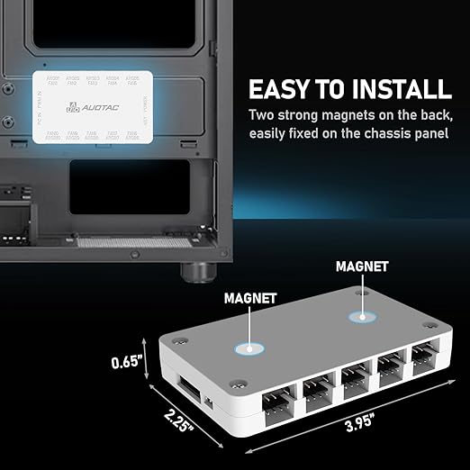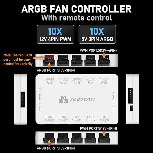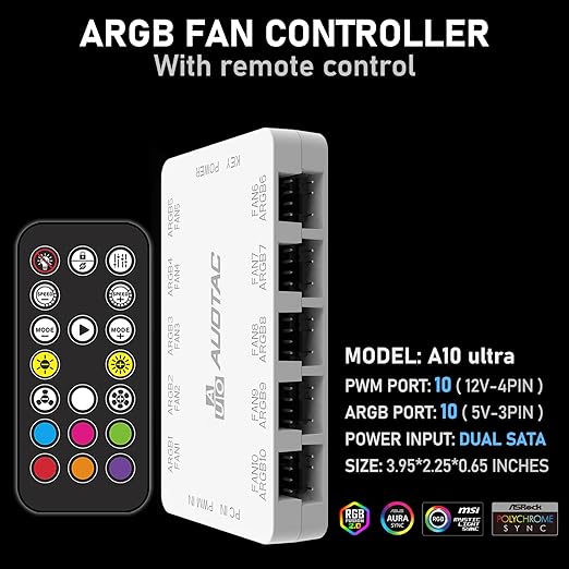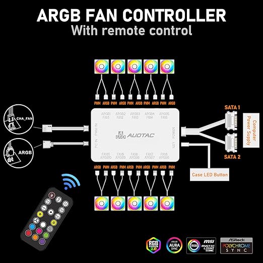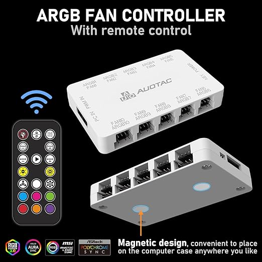 ARGB Controller PWM Fan Hub with RF Remote, (Connect Ten Case Fans, 5V 3Pin ARGB & 12V 4Pin PWM Fan Connector, Dual SATA Power Input, Magnetic Suction), White