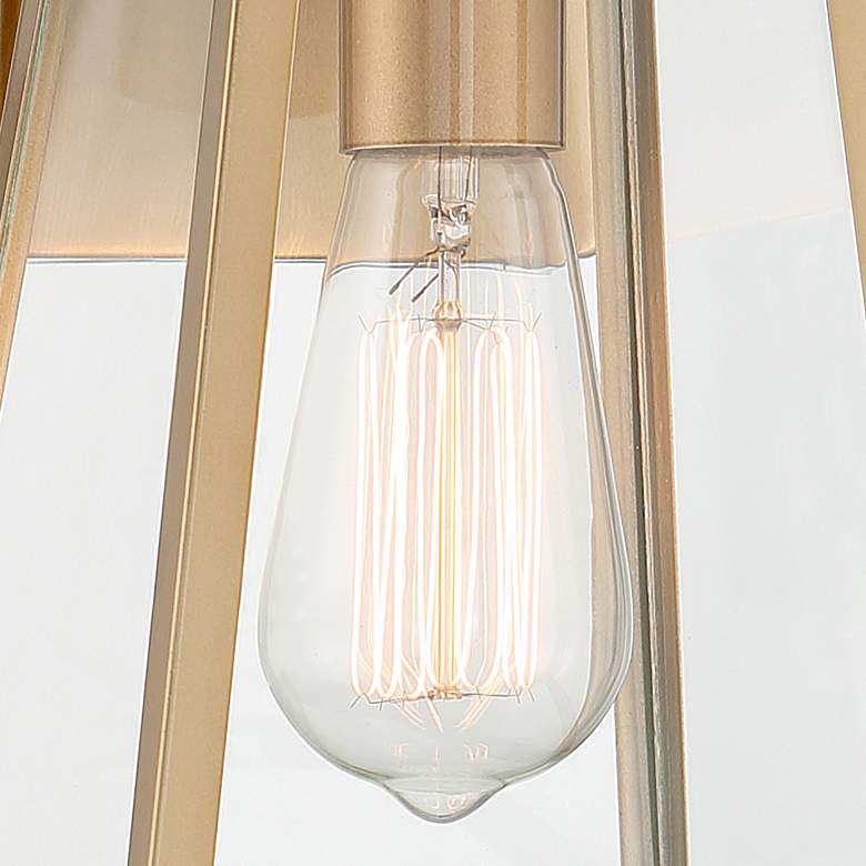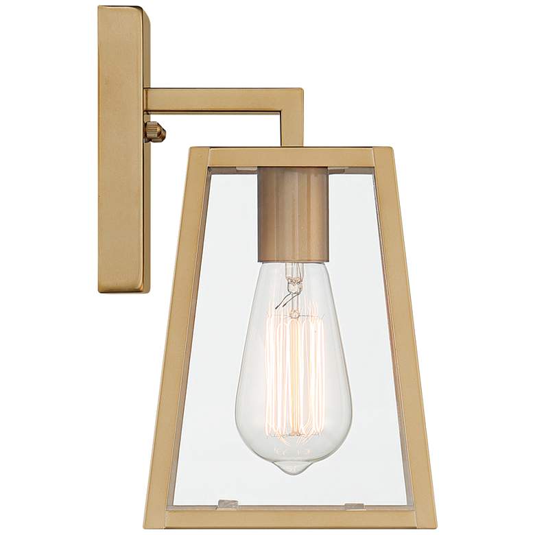 Brighten up your home's exterior with this handsome wall sconce set from the Arrington collection by John Timberland. This updated industrial design comes in a tapering soft gold finish frame with a sleek, straight-lined look. Clear glass panels offer a full view of the beautiful view of the bulb within. Damp location outdoor rated for indoor or bathroom use. Vertical installation and wall mount only.