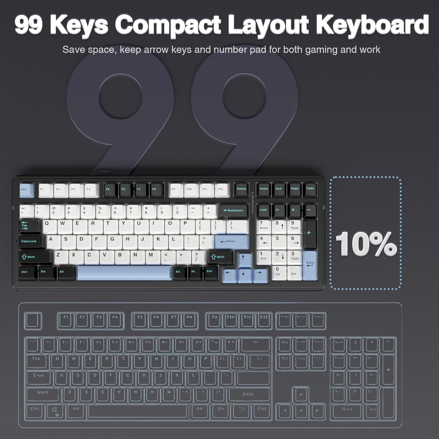 - PBT Keycaps and 8000mAh Battery: 99 keys 96% layout compact keyboard can save more desktop space while keep necessary arrow keys and number area for games and work. The rechargeable keyboard built-in 8000mAh large capcacity battery to provide more power and longer battery life. Double shot PBT keycaps, made from two colors material molded into each others, make the keycaps characters maintain the vibrance and saturation, clear and not fade