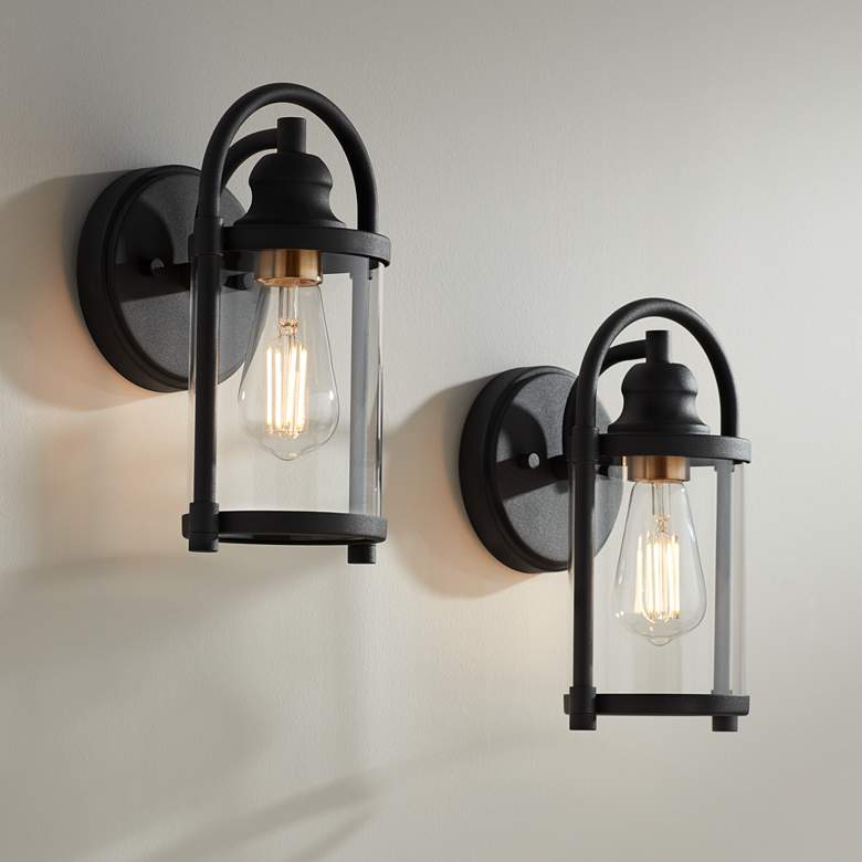 From the John Timberland brand, this set of two wall sconces offers a warm look for your home. It features clear cylinder glass, a black finish metal frame and top lantern arm, and a warm brass finish bulb socket. Easily upgrade your home's living or bathroom spaces with this classy light.