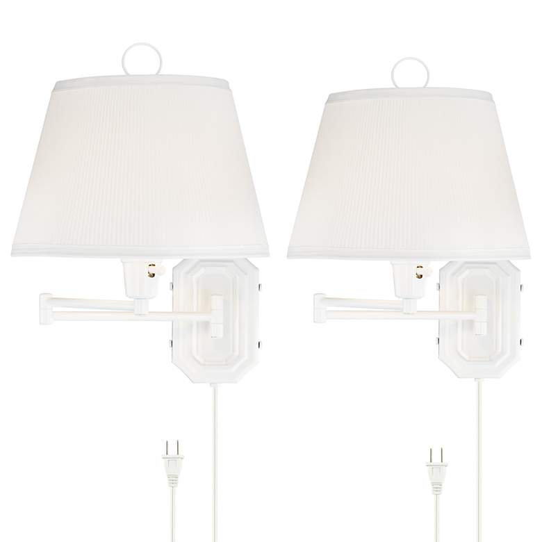 These monochromatic white swing arm wall lamps set of two can be a subtle source of light against a white wall. They can also make a more dramatic statement if mounted on a colorful surface. A white pleated shade completes the look. Each lamp uses a common outlet receptacle plug.