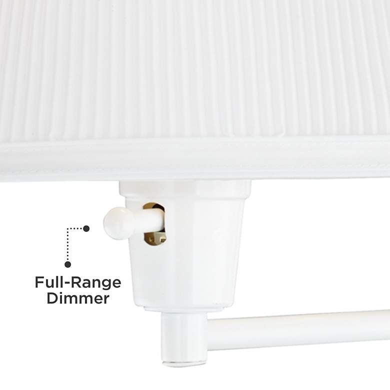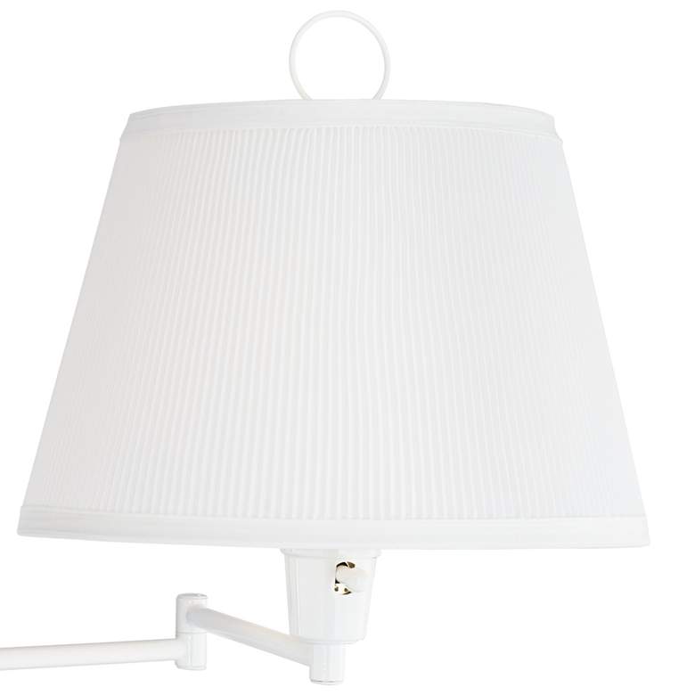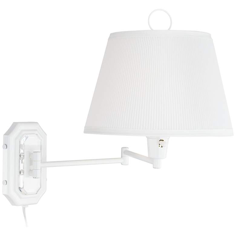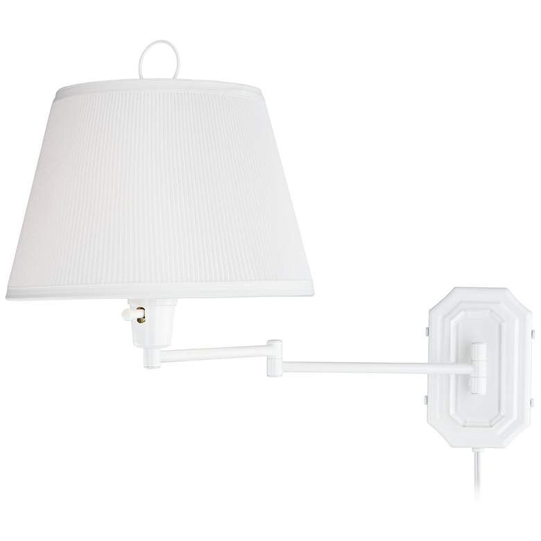 - White finish wall plate and swing arm. Pleated fabric bell shade up top. Plug-in lamp is easy to install, swing arm allows you to place light where you want.