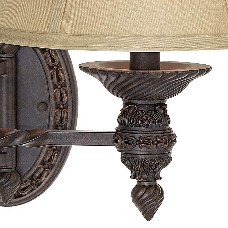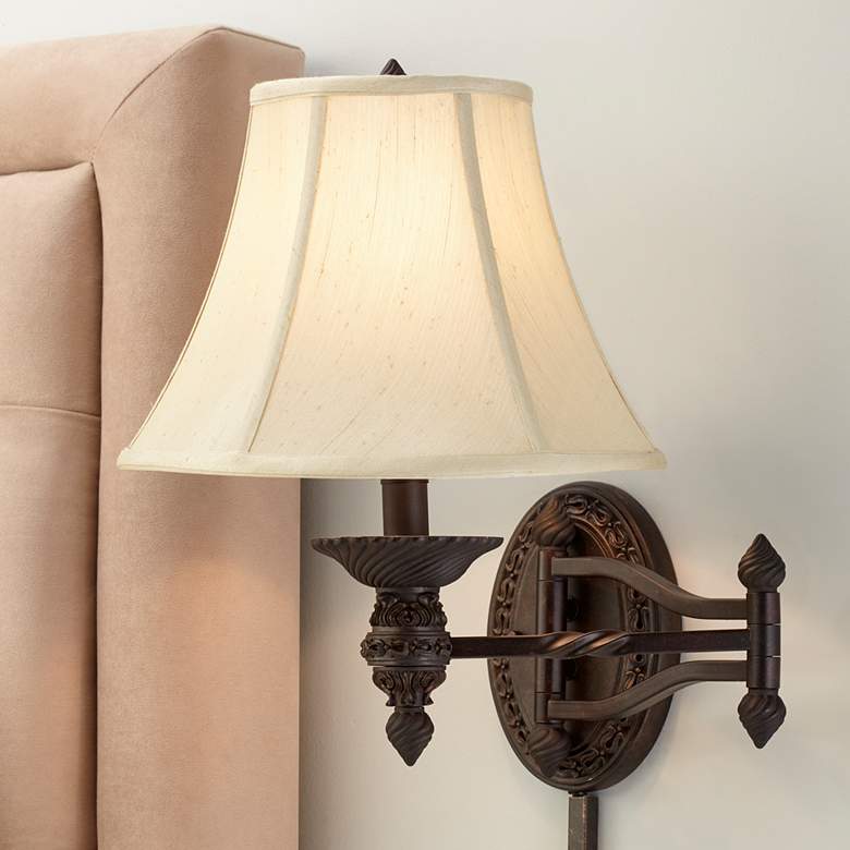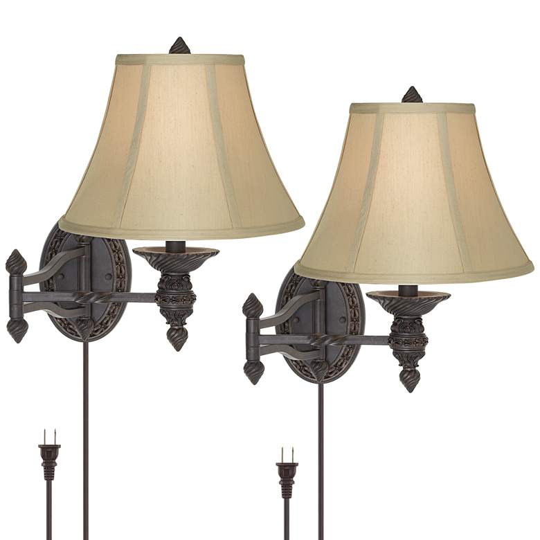 Embrace a traditional motif in lighting with this set of two swing-arm wall lamps from the Godia collection by Barnes and Ivy. Functional and beautiful, these lamps offer intricate construction of bronze finish metal with a swing-arm mechanism that expands lighting customization. Beige softback bell shades capture a romantic traditional look. Plug in these lamps to eliminate the need for wiring.