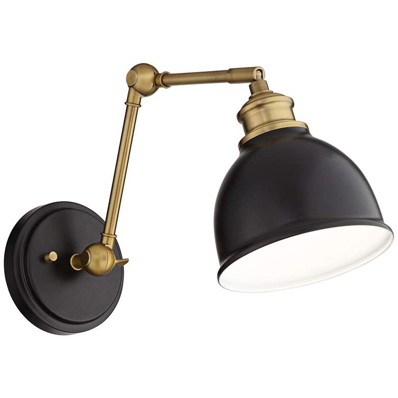 Make a room shine with these modern metal wall lamps set of two. Two adjustable articulation points allow for customized positioning, while a swivel on the lamp head adjusts up and down to guide light where it's needed. A black finish shade and backplate complement the antique brass finish hardware for a contemporary and industrial appeal.