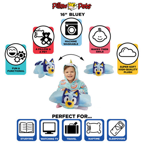 BLUEY: The world’s most favorite Australian Heeler puppy Bluey is now a Pillow Pet and a Sleeptime Lite! Bluey loves to play and learn with her little sister Bingo and her best friends, but also loves curling up for quiet time!