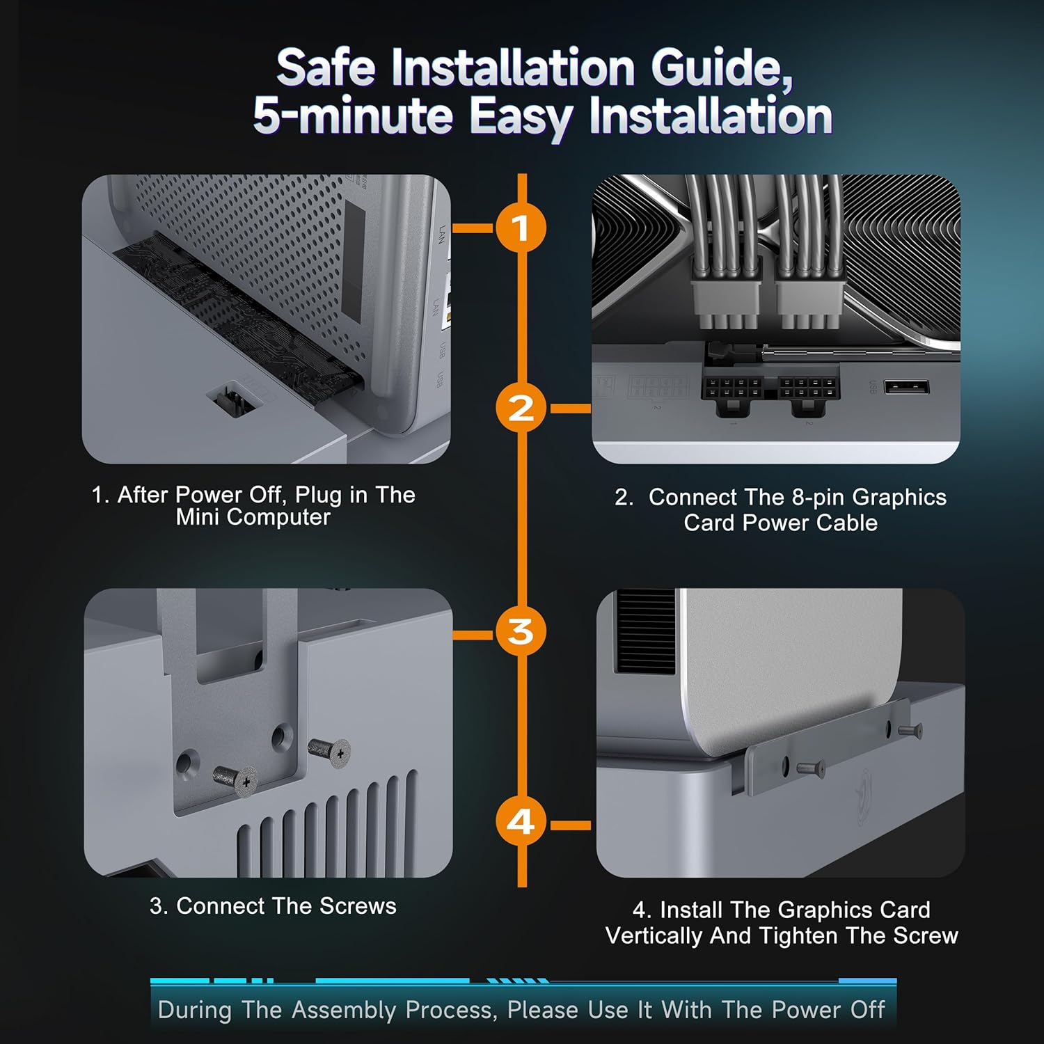 - 【Easy Installation】① Remove the PCle silicone plug at the bottom of the docking station, insert the circuit board into the PCle interface of the mini PC and fix it with M2.5 screws, ② Install the graphics card backplane and fix it, ③ Press the docking station tab, insert the graphics card vertically into the PCle slot and fix it with M3 screws, ④ Connect the graphics card power supply (8-pin interface) and display cable (HDMI/DP), ⑤ Start the Docking Station first, then start the mini pc