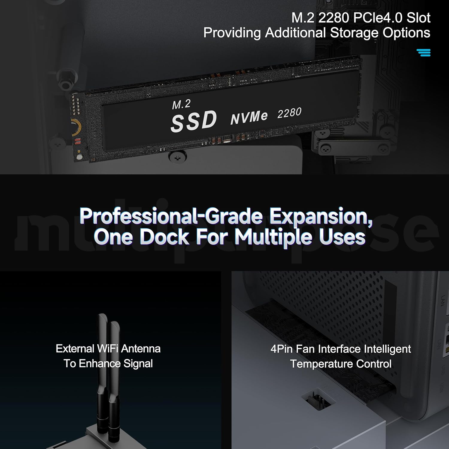 - 【Flexible Expansion, Efficient Choice】EX Docking Station supports M.2 2280 PCle 4.0 × 1 slot, providing users with additional storage solutions and improving data transmission efficiency (PCle4.0 bandwidth can reach 2GB/S). Through WiFi module support, it provides network connection function and enhances the flexibility of device networking. (SSD and WiFi cannot be used at the same time, and can be used flexibly according to different usage scenarios).