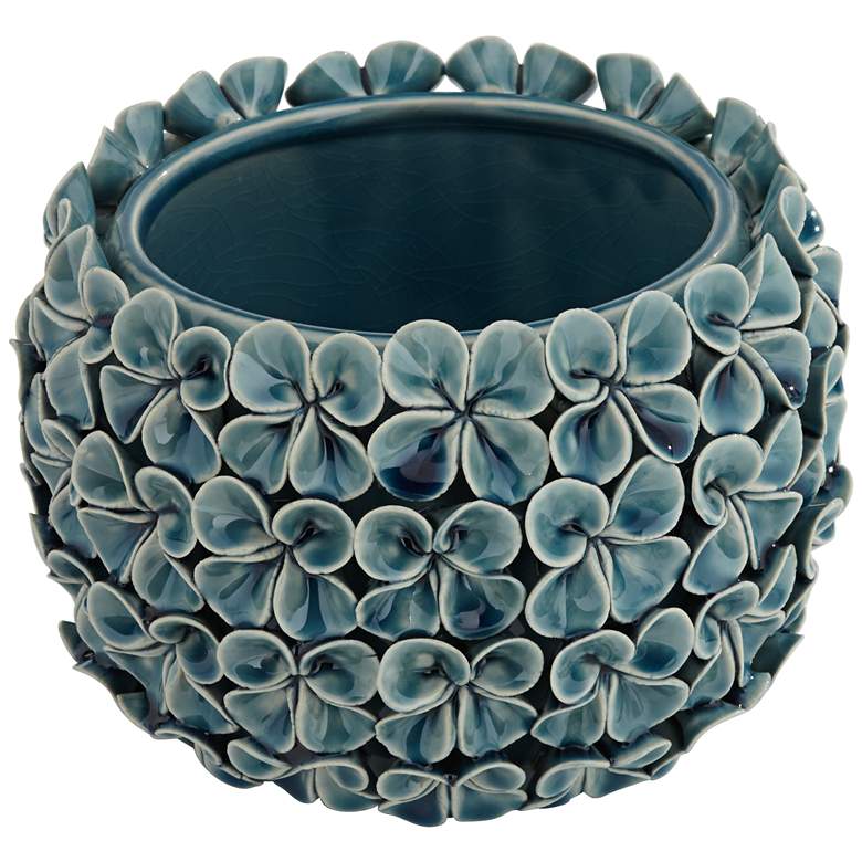 - Blue glazed finish over porcelain construction. Detailed 3D floral elements.